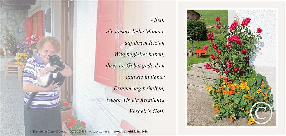 Vergelt‘s Gott allen, die an den Seelenrosenkränzen und an der Beerdigung von unserer lieben Mamme teilnehmen und sie in guter Erinnerung behalten.