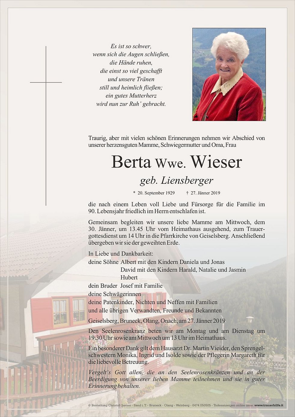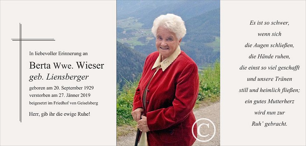 Gemeinsam begleiten wir unsere liebe Mamme am Mittwoch, dem 30. Jänner, um 13.45 Uhr vom Heimathaus ausgehend, zum Trauergottesdienst um 14 Uhr in die Pfarrkirche von Geiselsberg. Anschließend übergeben wir sie der geweihten Erde.