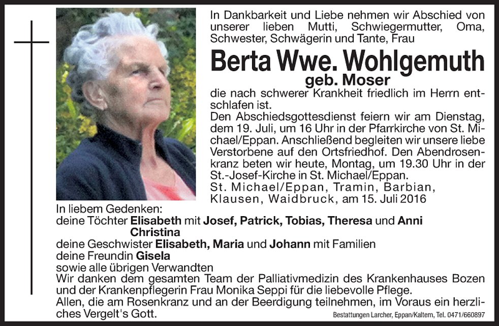 Den Abschiedsgottesdienst feiern wir am Dienstag, den 19. Juli um 16 Uhr in der Pfarrkirche von St. Michael/Eppan. Anschließend begleiten wir unsere liebe Verstorbene auf den Ortsfriedhof.
