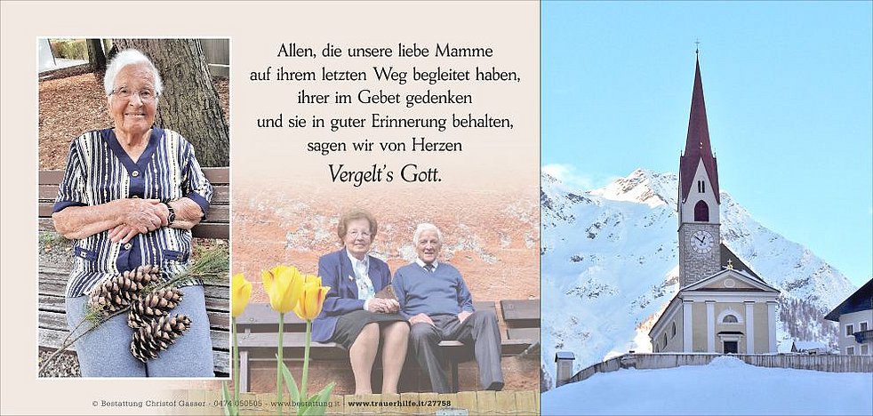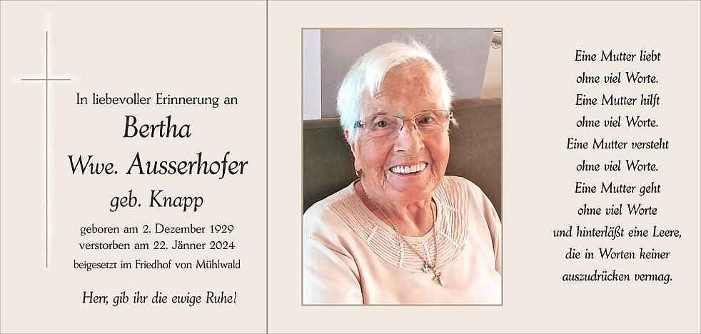 Gemeinsam begleiten wir unsere liebe Mamme am Freitag, dem 26. Jänner, um 14.15 Uhr vom Trauerhaus ausgehend, zum Abschiedsgottesdienst um 14.30 Uhr in die Pfarrkirche von Mühlwald.
