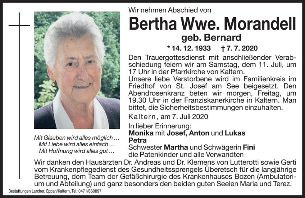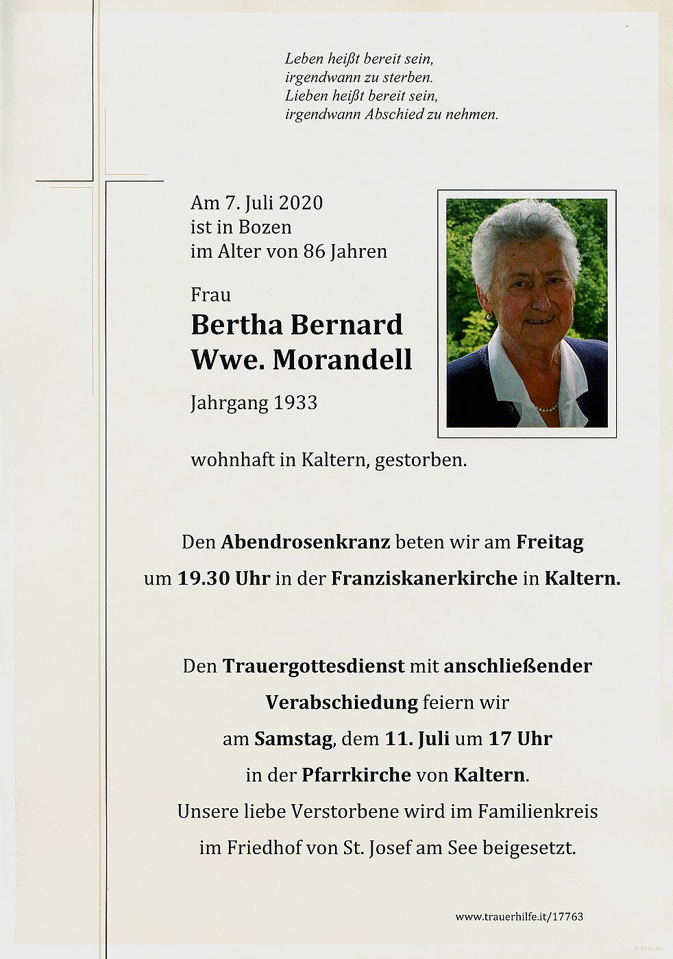 Den Trauergottesdienst mit anschließender Verabschiedung feiern wir am Samstag, dem 11. Juli um 17 Uhr in der Pfarrkirche von Kaltern.