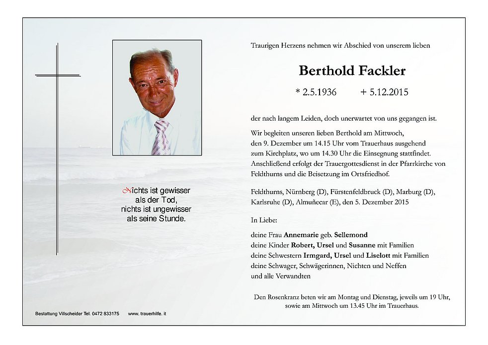 zum Kirchplatz, wo um 14.30 Uhr die Einsegnung stattfindet. Anschließend erfolgt der Trauergottesdienst in der Pfarrkirche von Feldthurns und die Beisetzung im Ortsfriedhof.