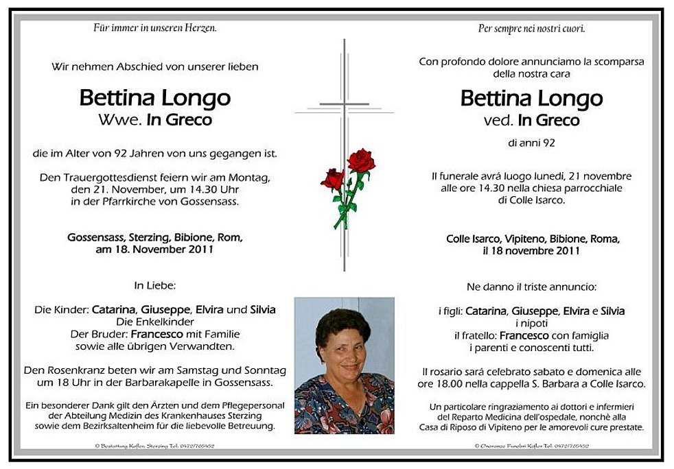 Un particolare ringraziamento ai dottori e infermieri del Reparto Medicina dell’ospedale, nonchè alla Casa di Riposo di Vipiteno per le amorevoli cure prestate.