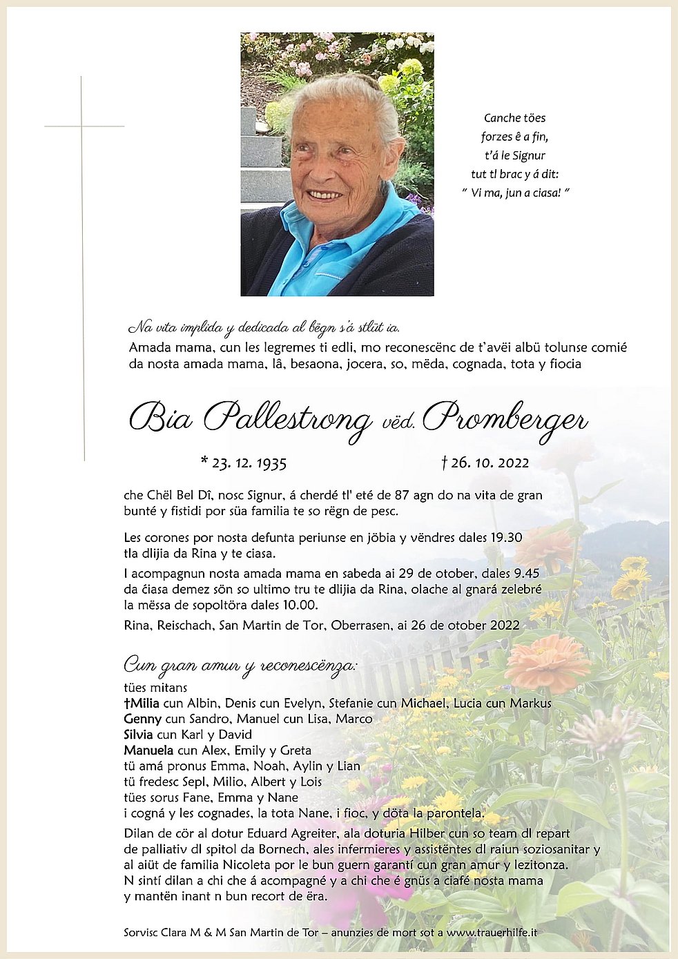 Einen herzlichen Dank dem Dr. Eduard Agreiter, der Frau Dr. Hilber mit dem Team der Abteilung Palliativ des Krankenhauses Bruneck, den Krankenschwestern des Sprengels Pikolein sowie der Pflegehelferin Nicoleta für die liebevolle Zuwendung und fürsorgliche Betreuung.
