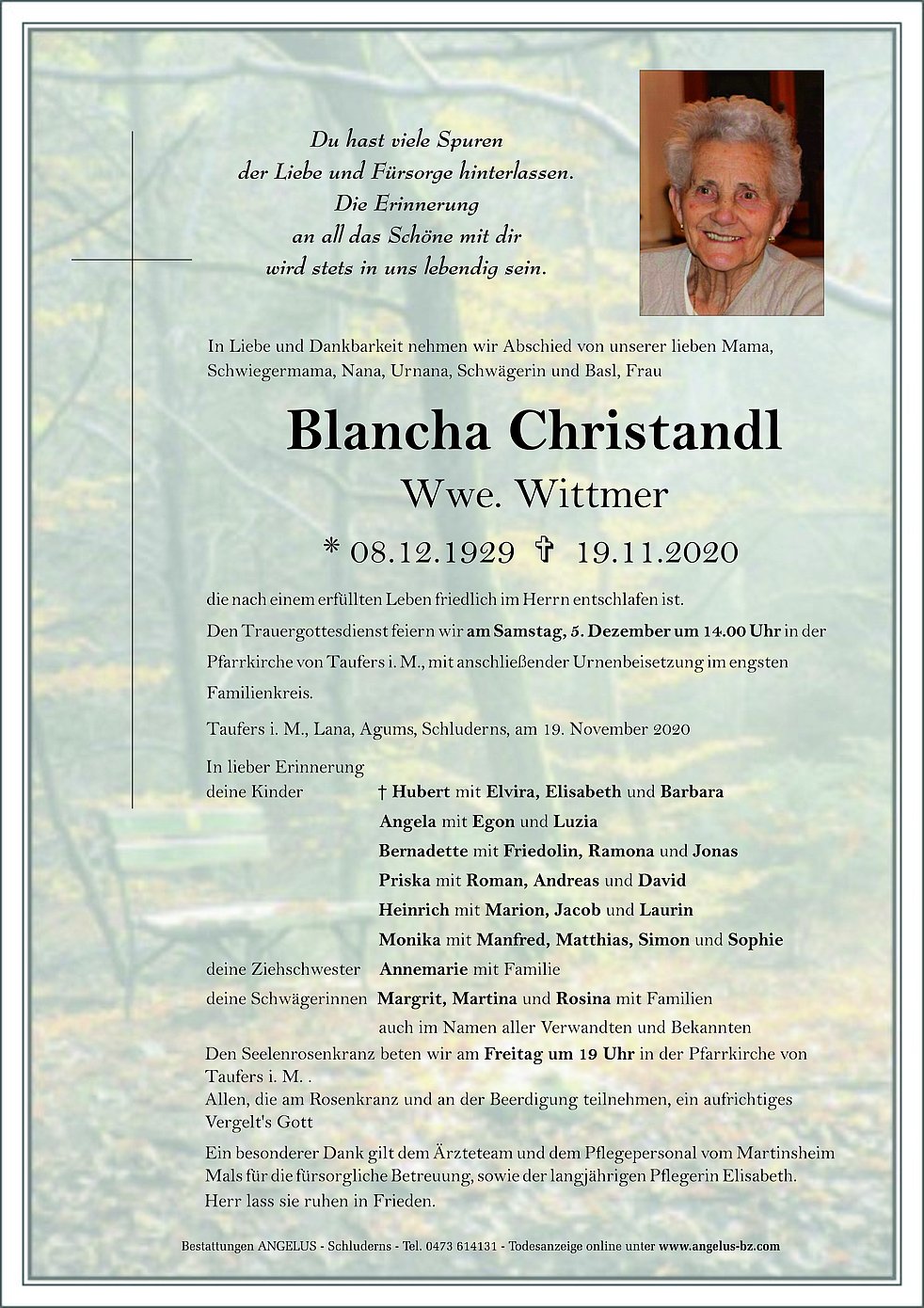 Den Trauergottesdienst feiern wir am Samstag, 5. Dezember um 14.00 Uhr in der Pfarrkirche von Taufers i. M., mit anschließender Urnenbeisetzung im engsten Familienkreis.