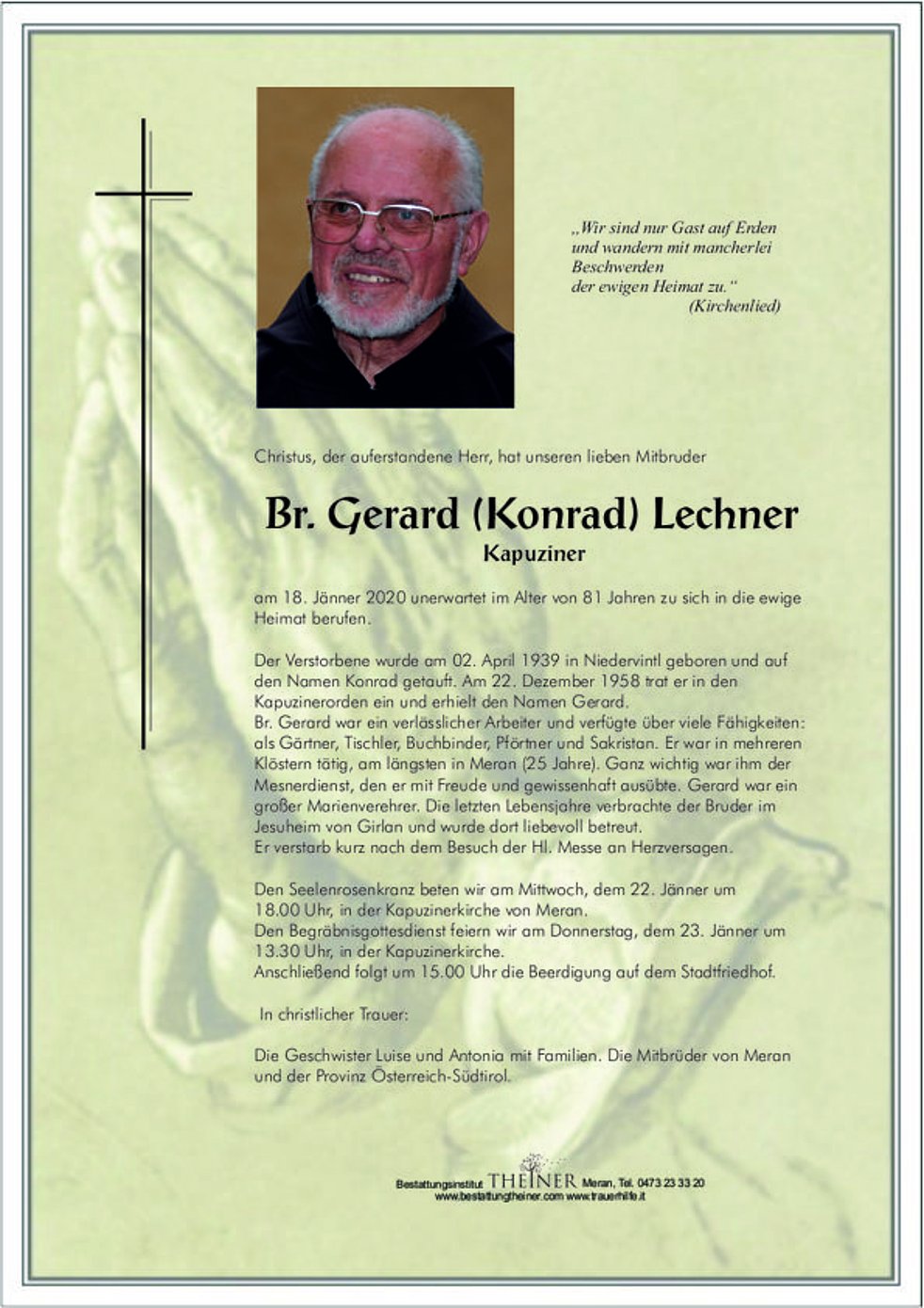 Der Verstorbene wurde am 02. April 1939 in Niedervintl geboren und auf den Namen Konrad getauft. Am 22. Dezember 1958 trat er in den Kapuzinerorden ein und erhielt den Namen Gerard.