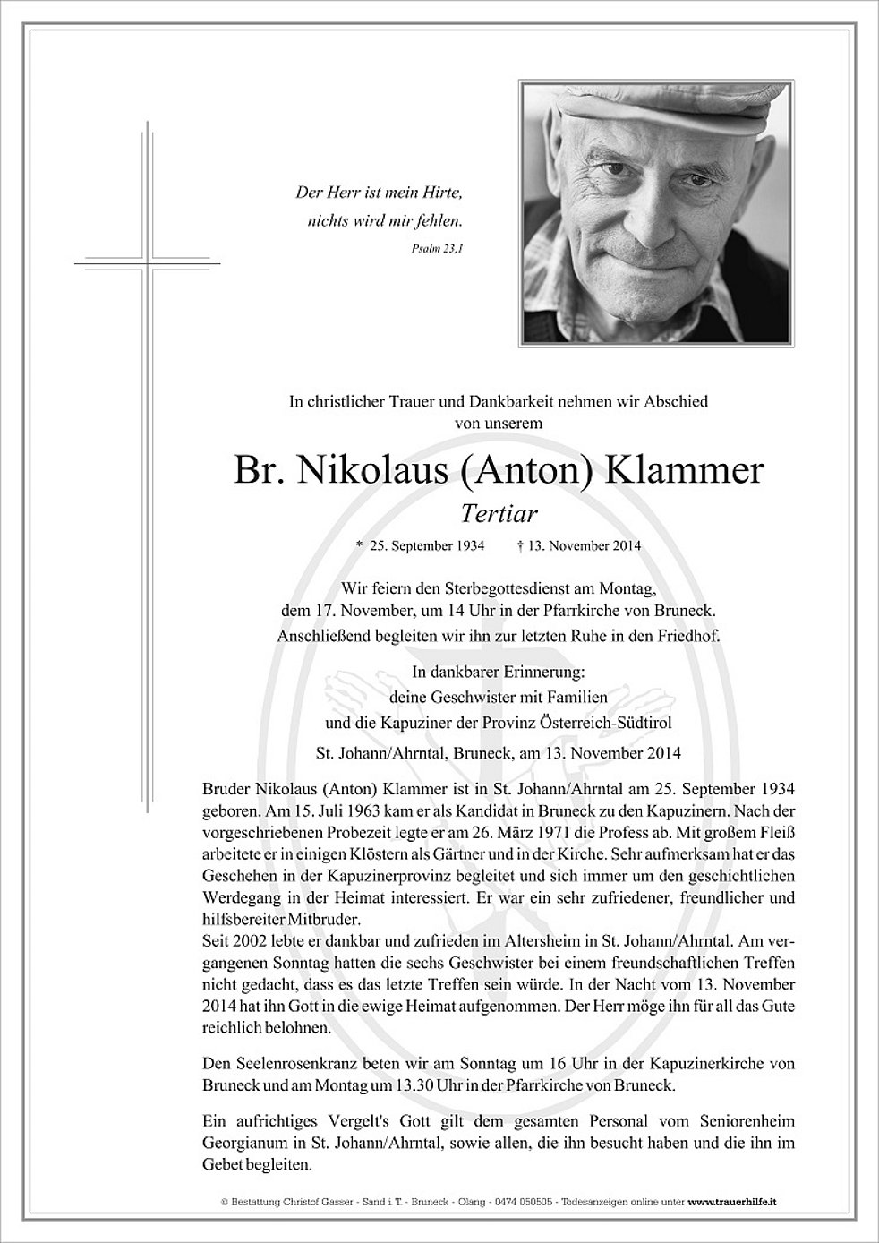 Bruder Nikolaus (Anton) Klammer ist in St. Johann/Ahrntal am 25. September 1934 geboren. Am 15. Juli 1963 kam er als Kandidat in Bruneck zu den Kapuzinern. Nach der vorgeschriebenen Probezeit legte er am 26. März 1971 die Profess ab. Mit großem Fleiß arbeitete er in einigen Klöstern als Gärtner und in der Kirche. Sehr aufmerksam hat er das Geschehen in der Kapuzinerprovinz begleitet und sich immer um den geschichtlichen Werdegang in der Heimat interessiert. Er war ein sehr zufriedener, freundlicher und hilfsbereiter Mitbruder.