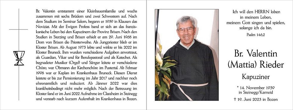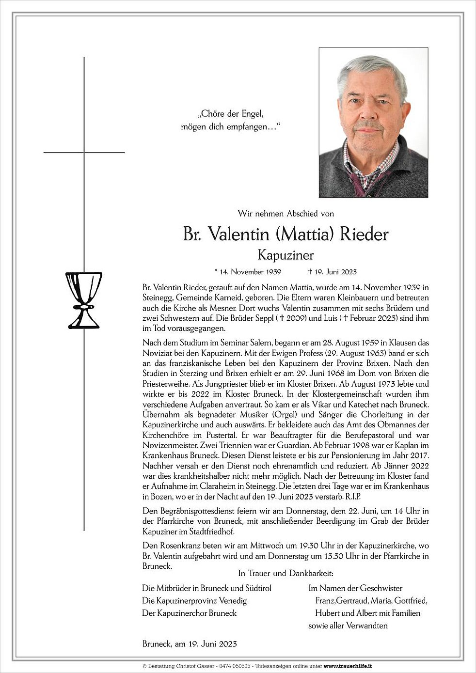 Br. Valentin Rieder, getauft auf den Namen Mattia, wurde am 14. November 1939 in Steinegg, Gemeinde Karneid, geboren. Die Eltern waren Kleinbauern und betreuten auch die Kirche als Mesner. Dort wuchs Valentin zusammen mit sechs Brüdern und zwei Schwestern auf. Die Brüder Seppl ( † 2009) und Luis ( † Februar 2023) sind ihm im Tod vorausgegangen.