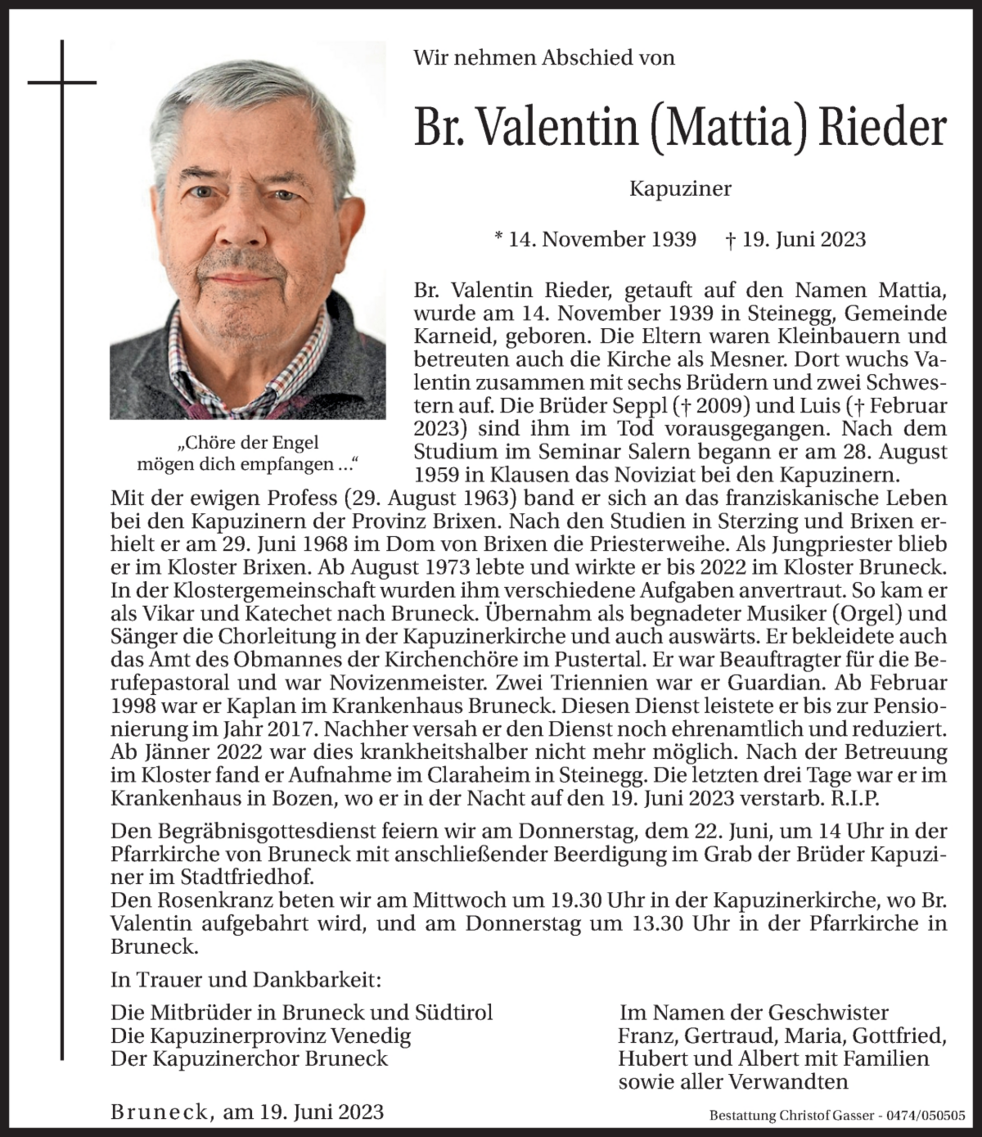 Den Begräbnisgottesdienst feiern wir am Donnerstag, dem 22. Juni, um 14 Uhr in der Pfarrkirche von Bruneck, mit anschließender Beerdigung im Grab der Brüder Kapuziner im Stadtfriedhof.