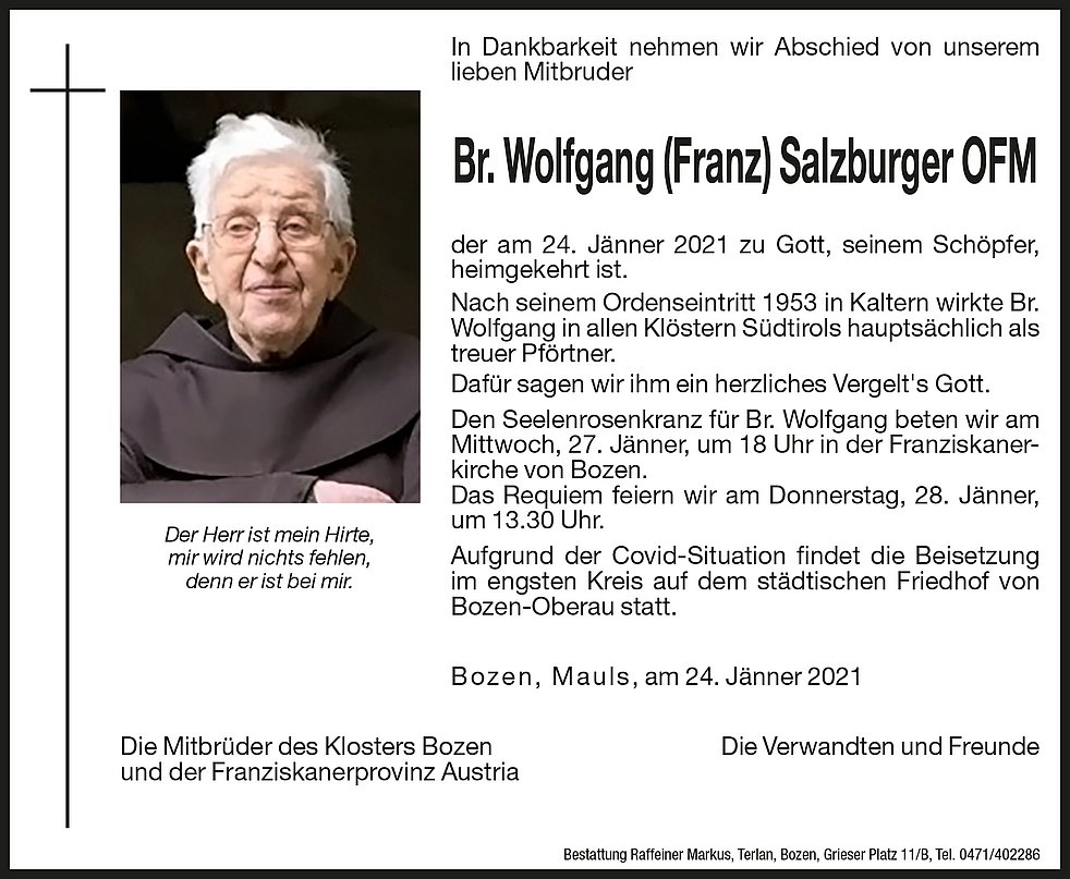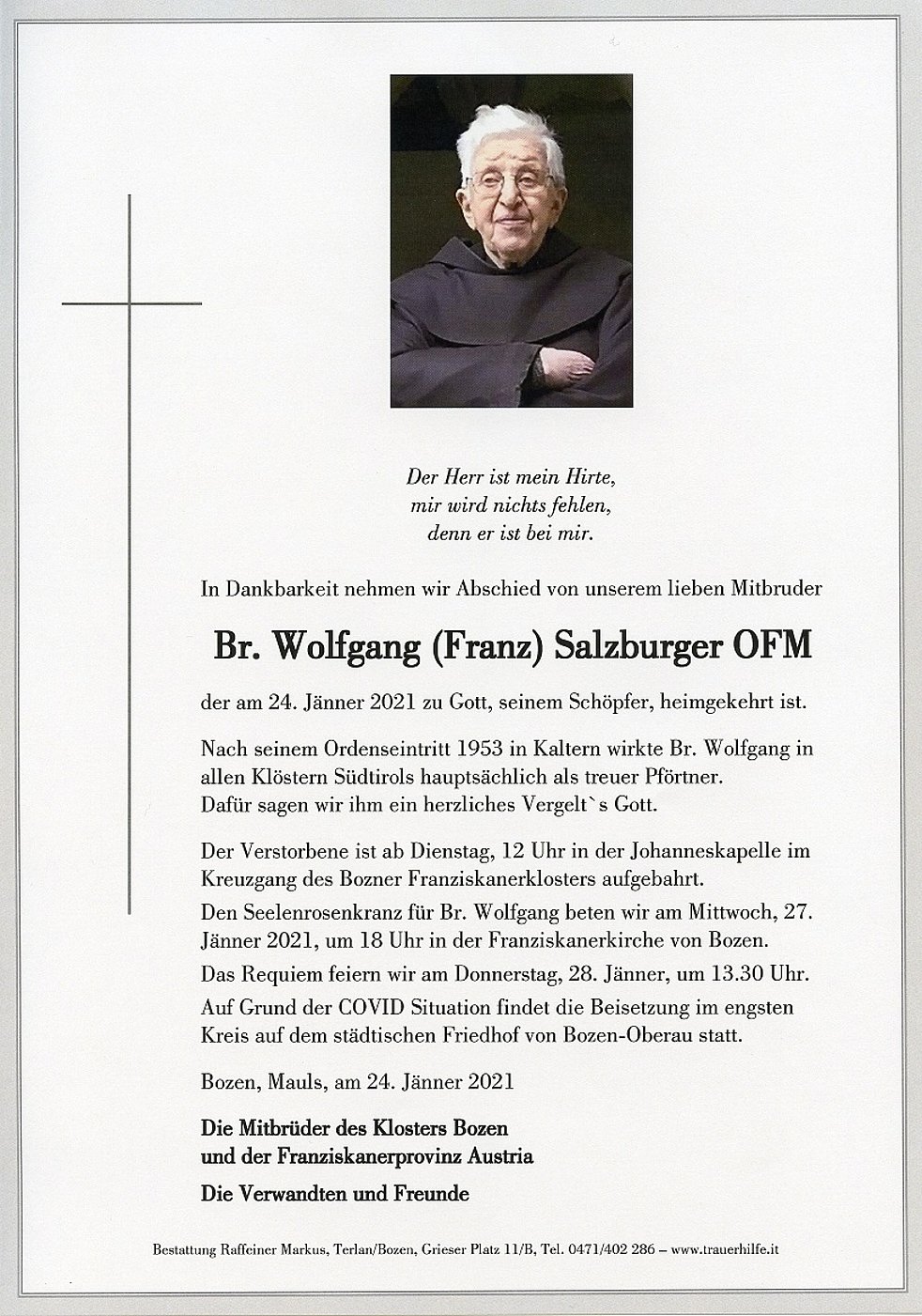 Den Seelenrosenkranz für Br. Wolfgang beten wir am Mittwoch, 27. Jänner 2021, um 18 Uhr in der Franziskanerkirche von Bozen.