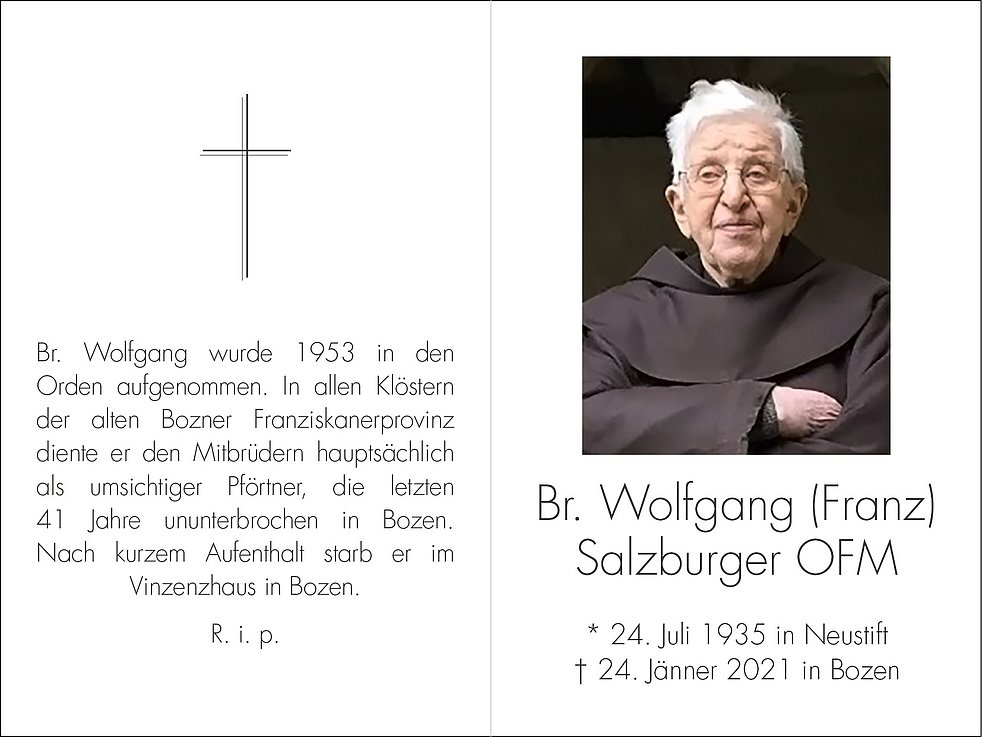 Nach seinem Ordenseintritt 1953 in Kaltern wirkte Br. Wolfgang in allen Klöstern Südtirols hauptsächlich als treuer Pförtner.