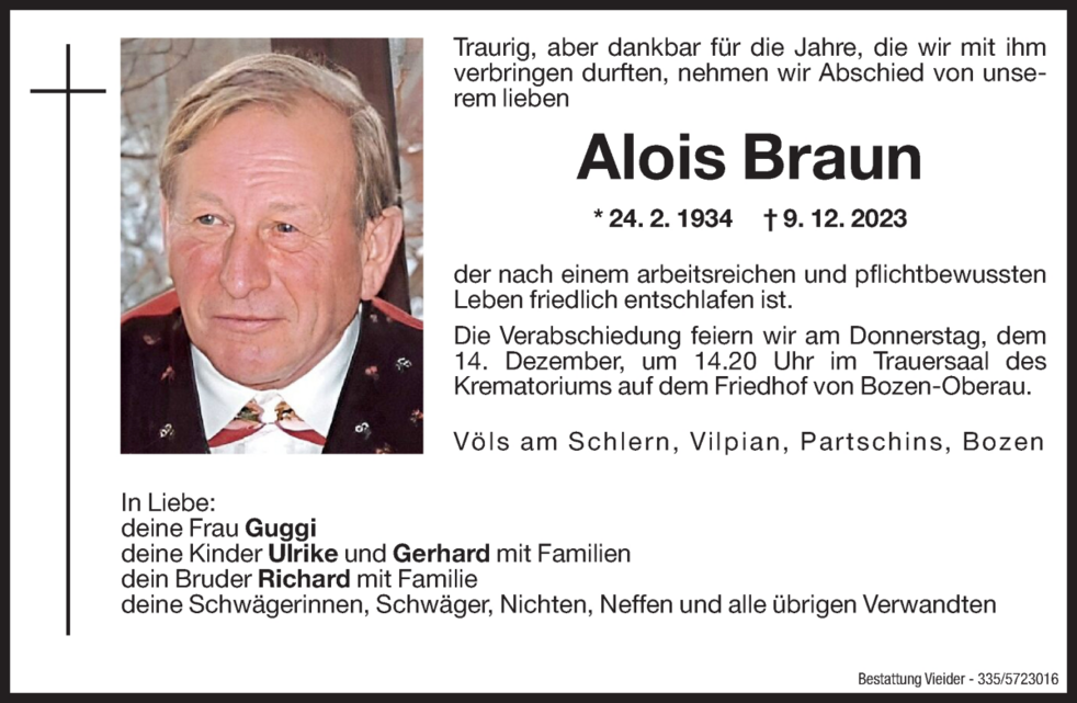 Die Verabschiedung feiern wir am Donnerstag, dem 14. Dezember um 14.20 Uhr im Trauersaal des Krematoriums Friedhof Bozen-Oberau.
