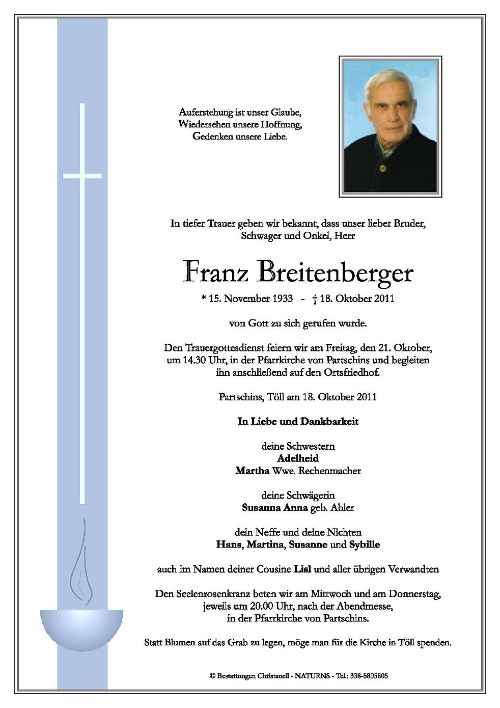Den Trauergottesdienst feiern wir am Freitag, den 21. Oktober, um 14.30 Uhr, in der Pfarrkirche von Partschins und begleiten ihn anschließend auf den Ortsfriedhof.