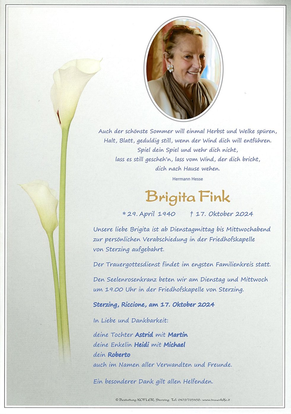 Unsere liebe Brigita ist ab Dienstagmittag bis Mittwochabend zur persönlichen Verabschiedung in der Friedhofskapelle von Sterzing aufgebahrt.