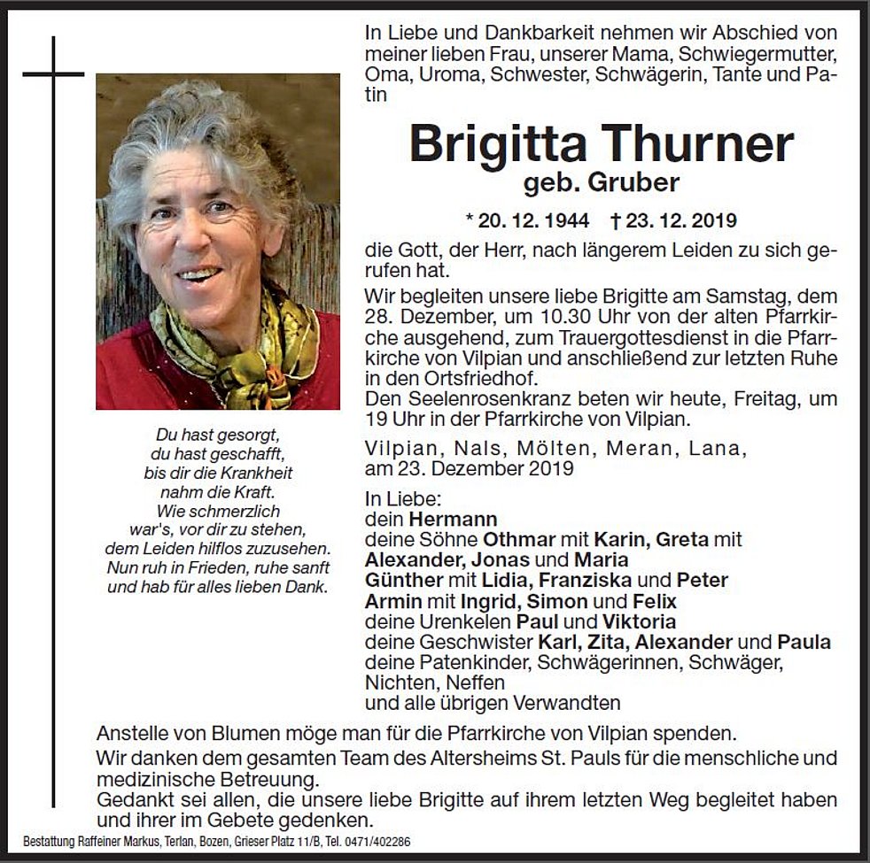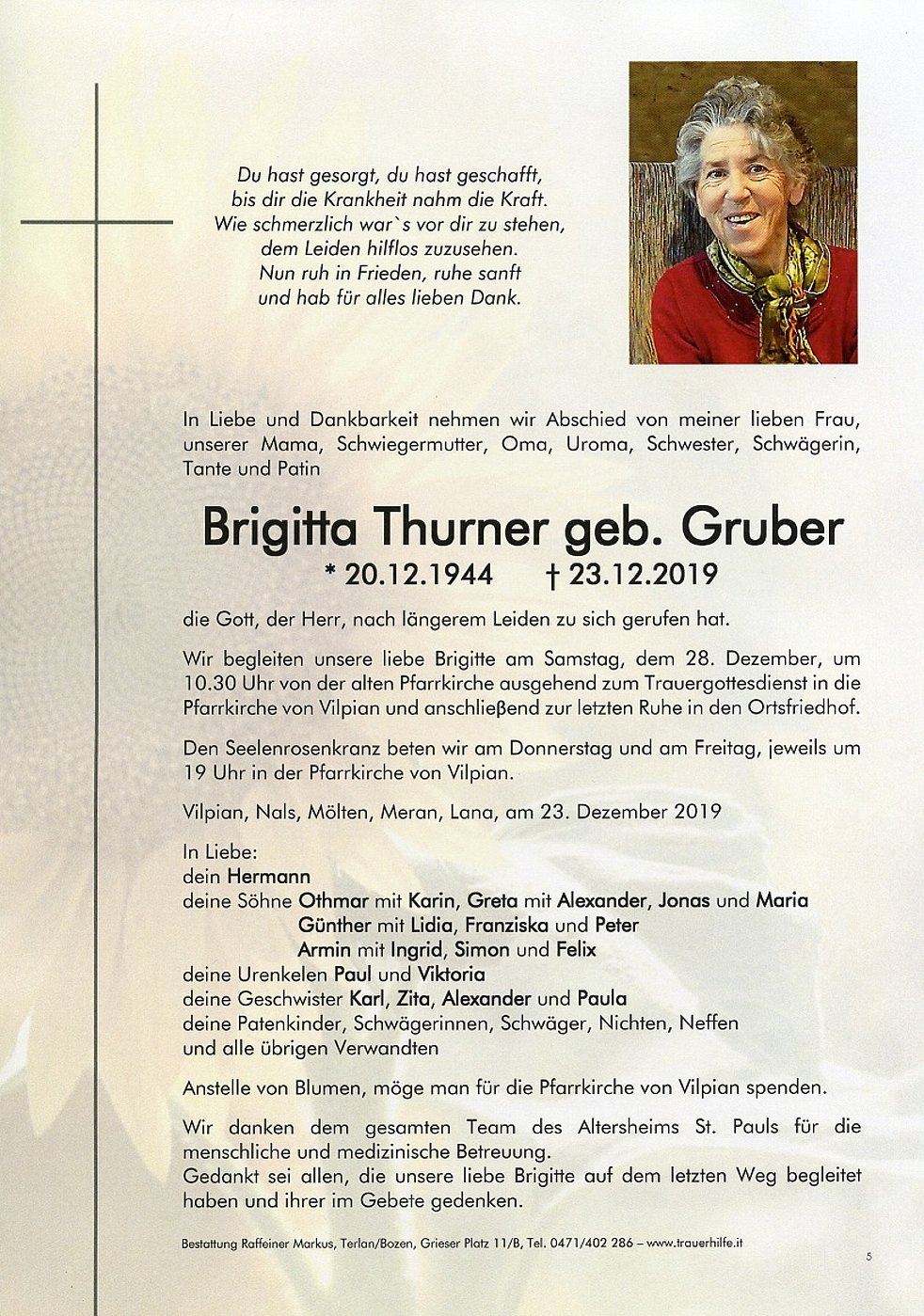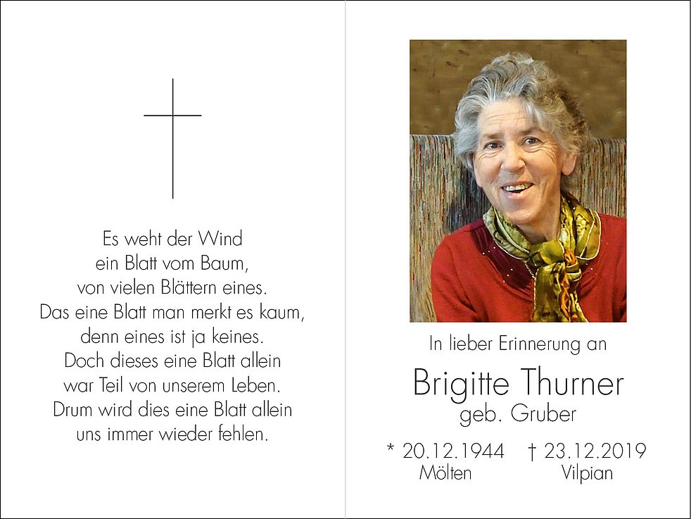 Wir begleiten unsere liebe Brigitte am Samstag, dem 28. Dezember, um 10.30 Uhr von der alten Pfarrkirche ausgehend zum Trauergottesdienst in die Pfarrkirche von Vilpian und anschlieβend zur letzten Ruhe in den Ortsfriedhof.