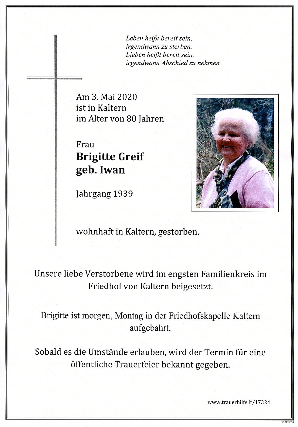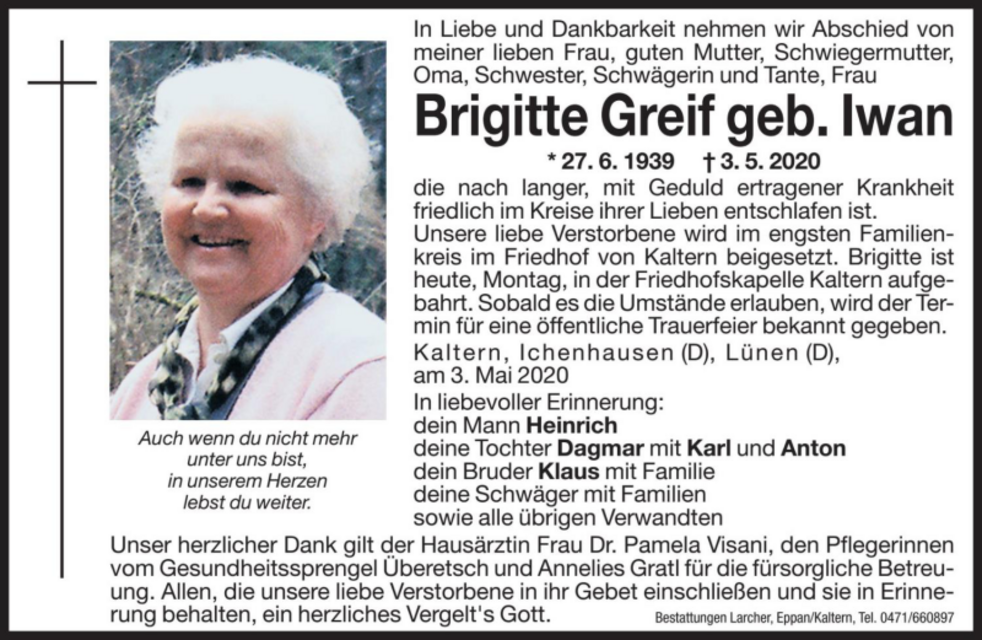 Unsere liebe Verstorbene wird im engsten Familienkreis im Friedhof von Kaltern beigesetzt.