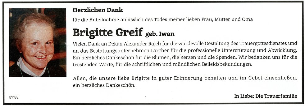 Allen, die unsere liebe Verstorbene in ihr Gebet einschließen und sie in Erinnerung behalten, ein herzliches Vergelt´s Gott.
