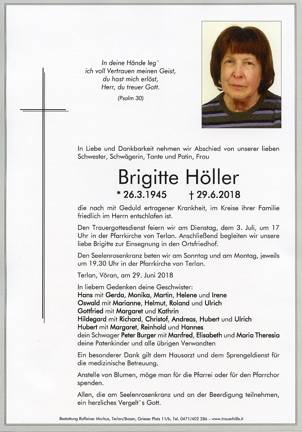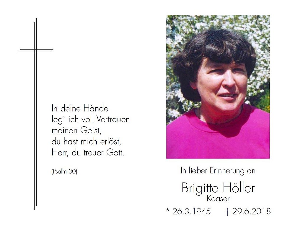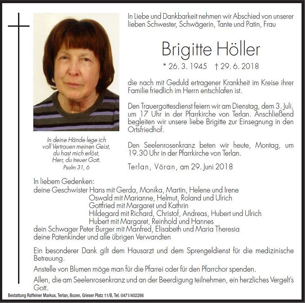 Den Trauergottesdienst feiern wir am Dienstag, dem 3. Juli, um 17 Uhr in der Pfarrkirche von Terlan. Anschließend begleiten wir unsere liebe Brigitte zur Einsegnung in den Ortsfriedhof.
