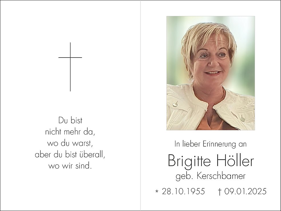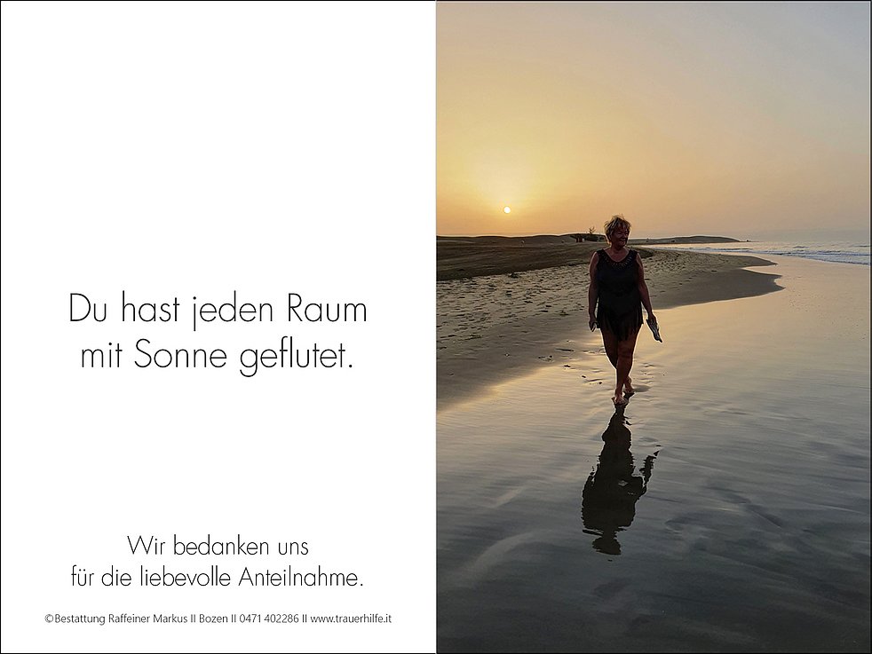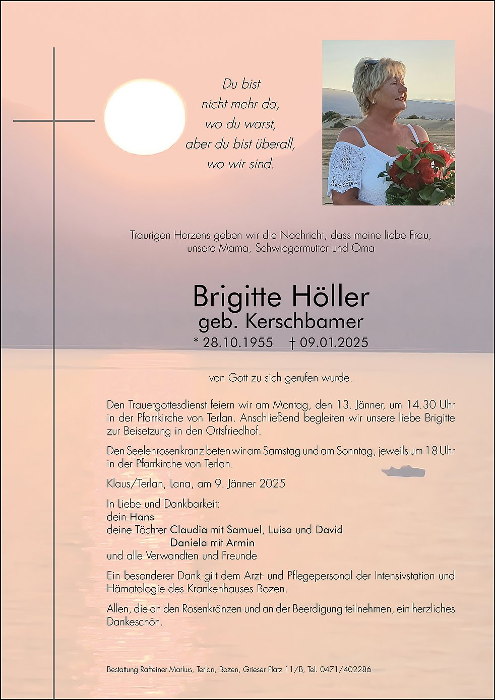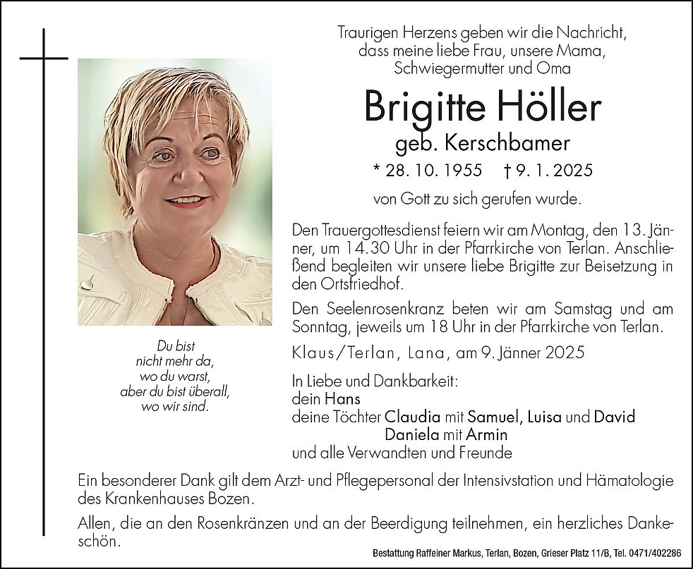 Den Trauergottesdienst feiern wir am Montag, den 13. Jänner, um 14.30 Uhr in der Pfarrkirche von Terlan. Anschließend begleiten wir unsere liebe Brigitte zur Beisetzung in den Ortsfriedhof.