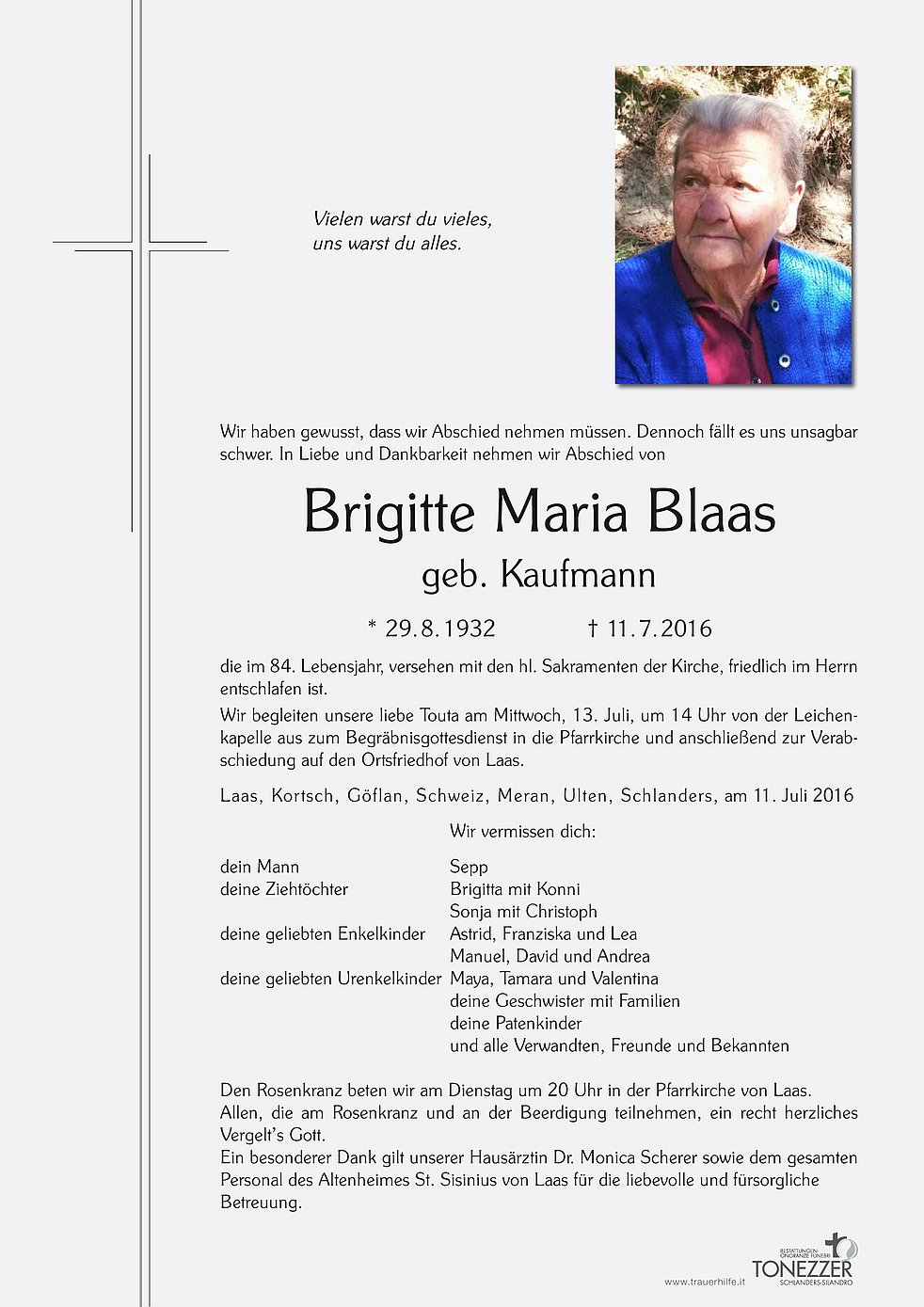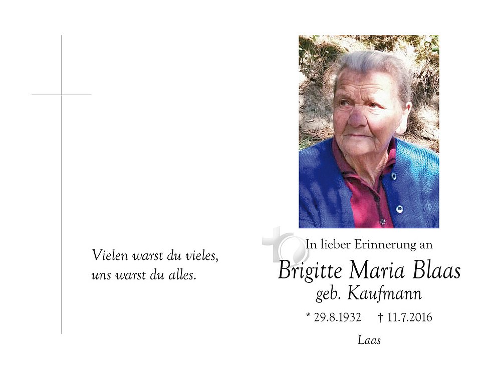 Wir begleiten unsere liebe Touta am Mittwoch, 13. Juli, um 14 Uhr von der Leichenkapelle aus zum Begräbnisgottesdienst in die Pfarrkirche und anschließend zur Verabschiedung auf den Ortsfriedhof von Laas.