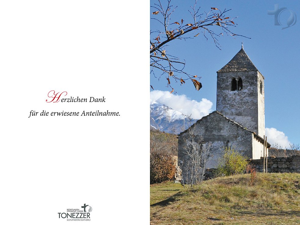 Ein besonderer Dank gilt unserer Hausärztin Dr. Monica Scherer sowie dem gesamten Personal des Altenheimes St. Sisinius von Laas für die liebevolle und fürsorgliche Betreuung.