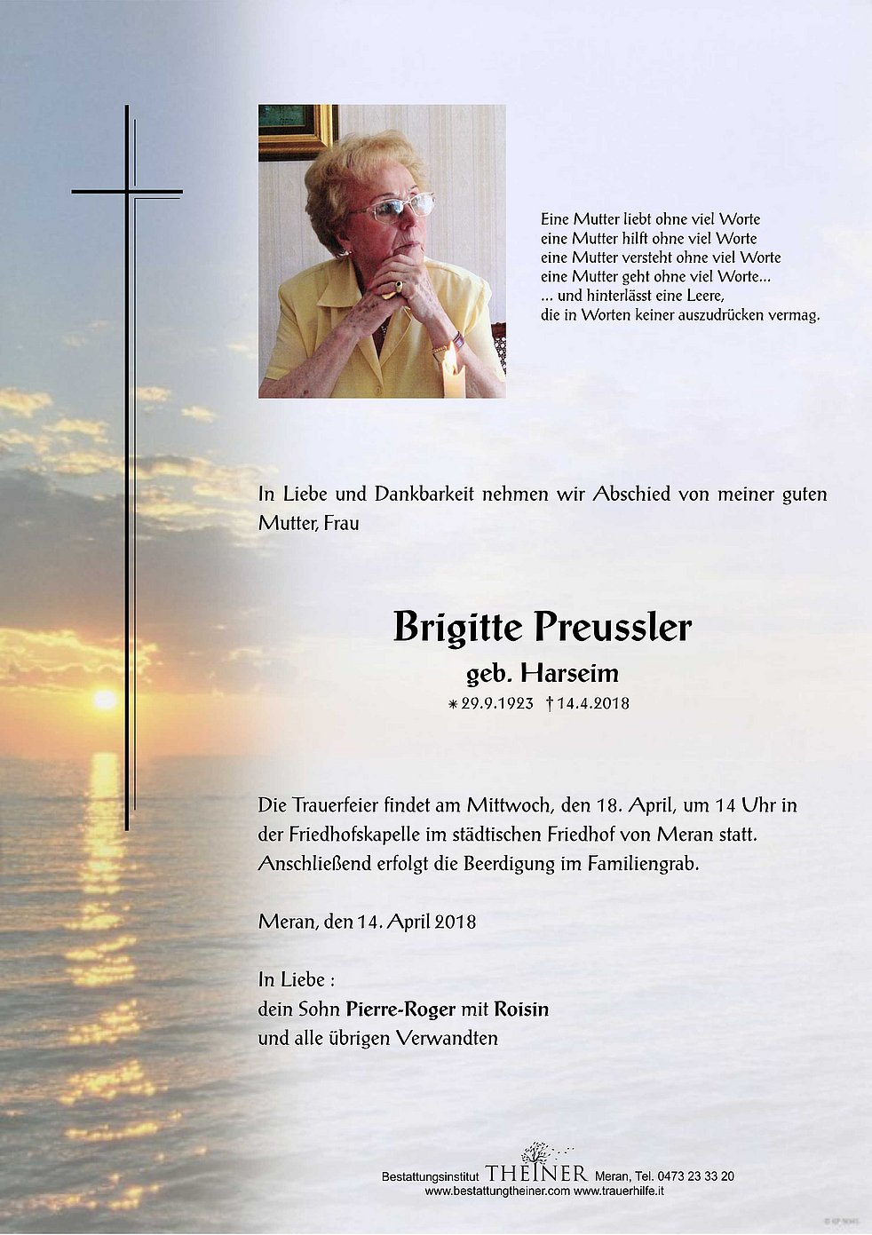 Die Trauerfeier findet am Mittwoch, den 18. April, um 14 Uhr in der Friedhofskapelle im städtischen Friedhof von Meran statt. Anschließend erfolgt die Beerdigung im Familiengrab.