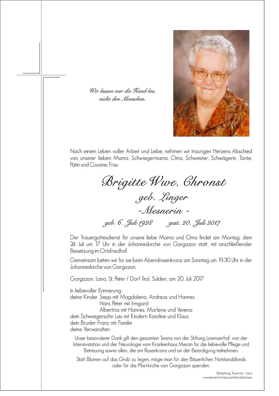 Herzliches Beileid. Fam. Martin Lintner, Terlan