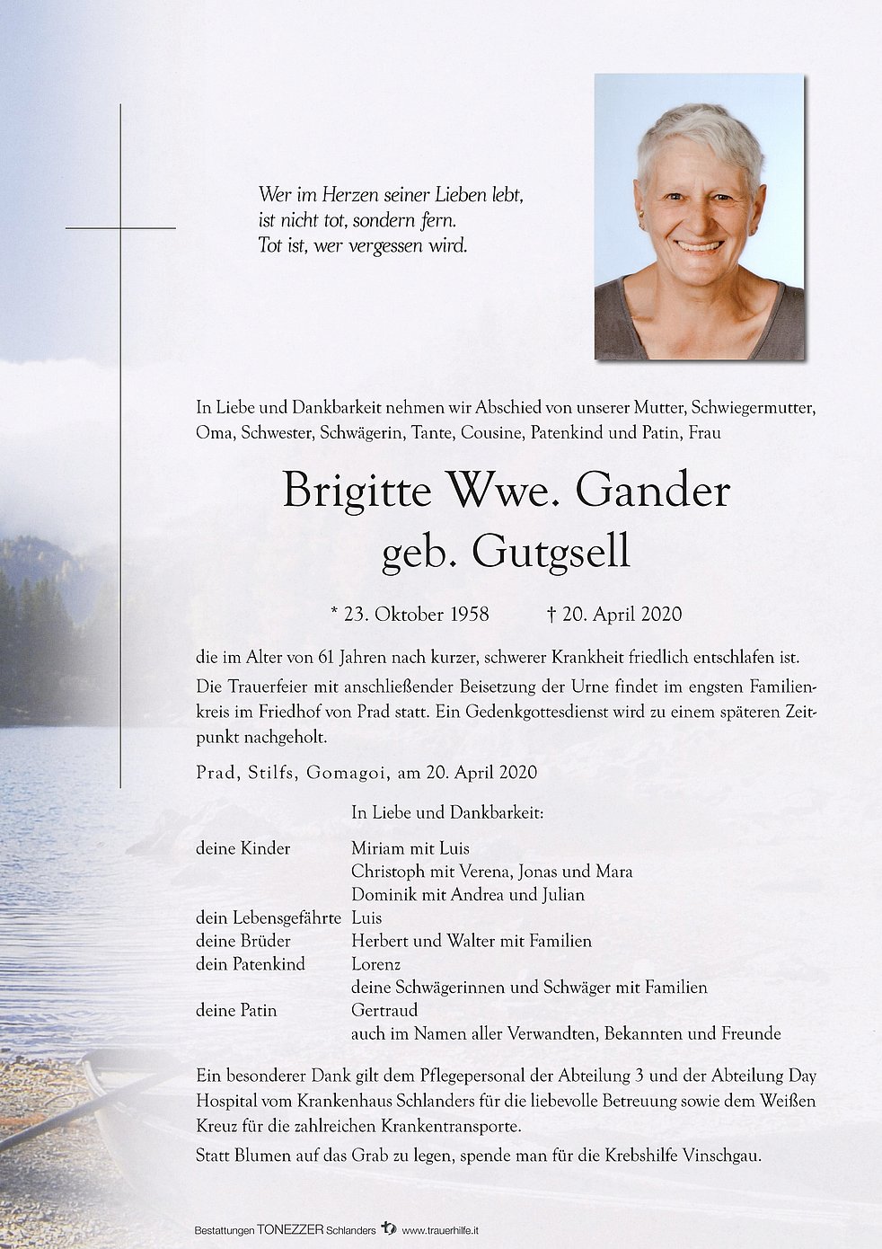 Die Trauerfeier mit anschließender Beisetzung der Urne findet im engsten Familienkreis im Friedhof von Prad statt. Ein Gedenkgottesdienst wird zu einem späteren Zeitpunkt nachgeholt.