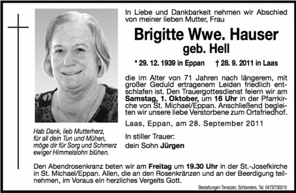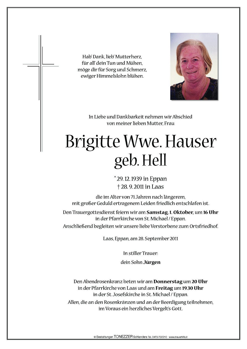 Den Trauergottesdienst feiern wir am Samstag, 1. Oktober, um 16 Uhr in der Pfarrkirche von St. Michael / Eppan.