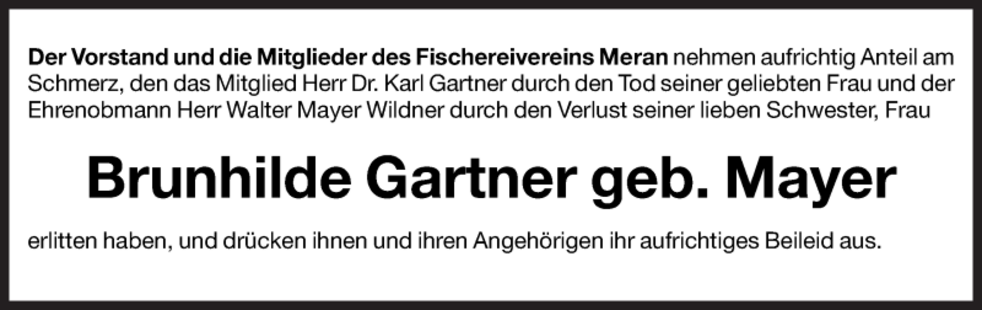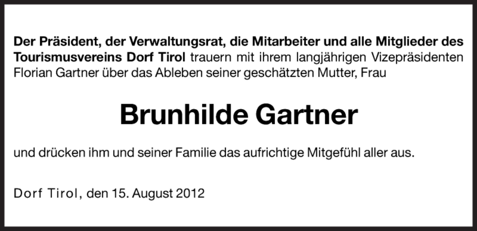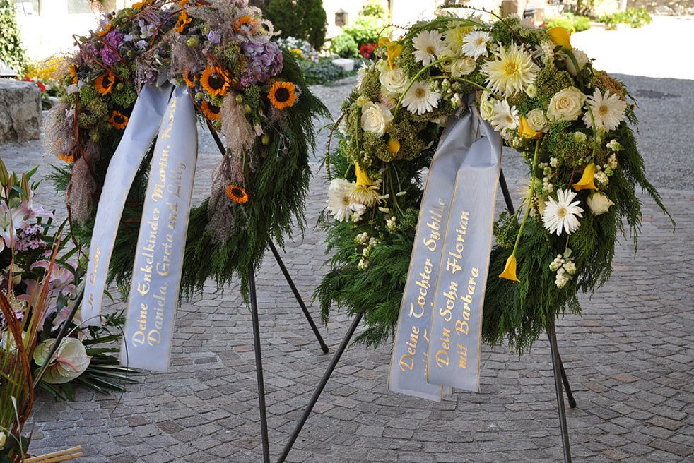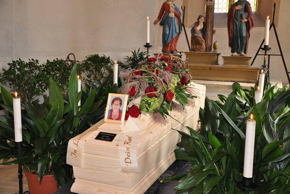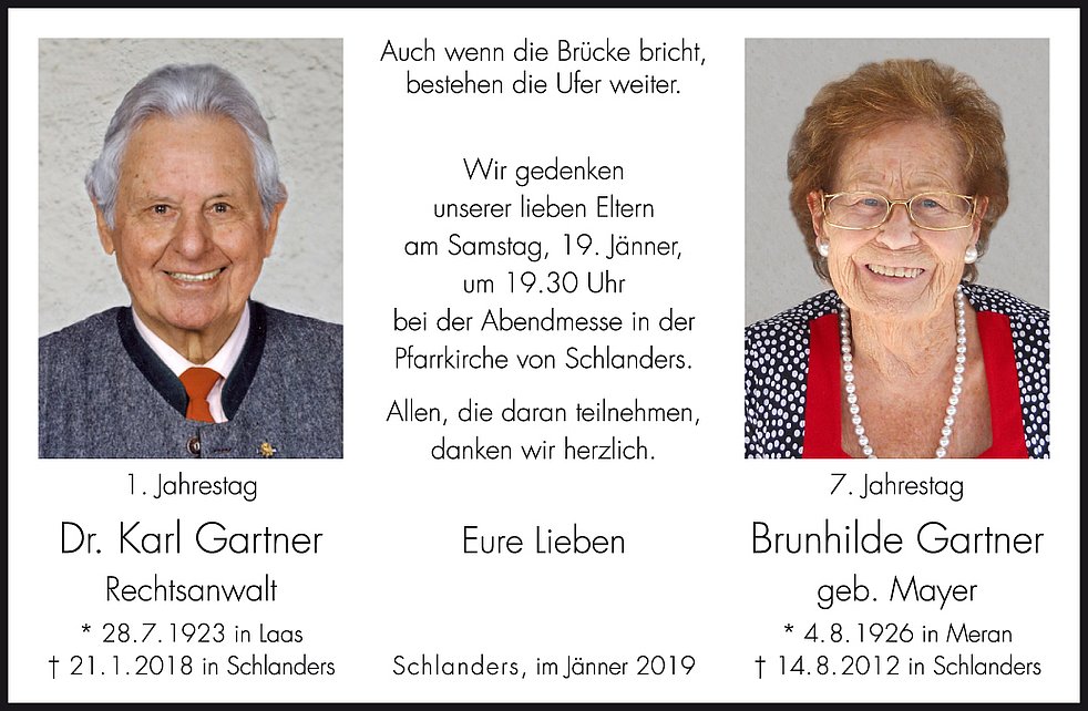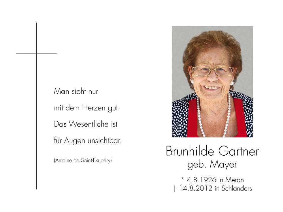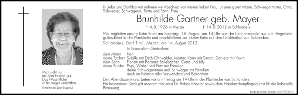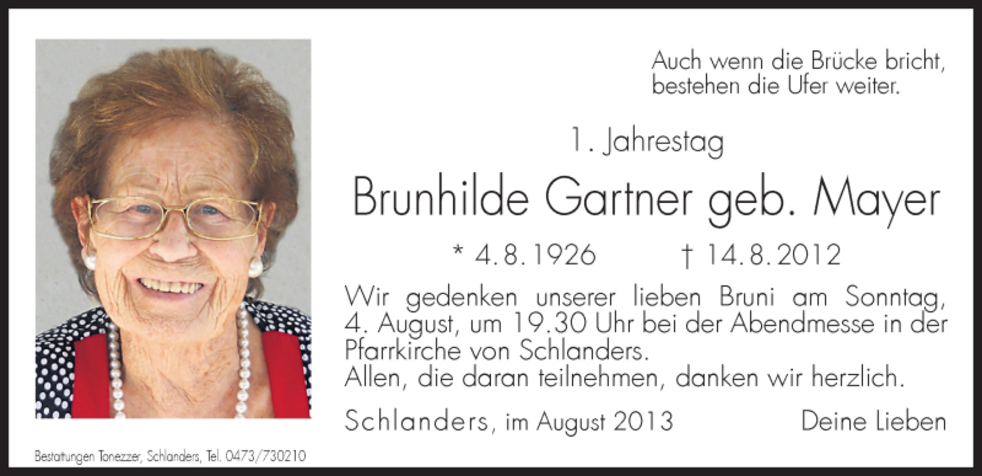 Wir begleiten unsere liebe Bruni am Samstag, 18. August, um 14 Uhr von der Leichenkapelle aus zum Begräbnisgottesdienst in die Pfarrkirche und anschließend zur letzten Ruhe auf den Ortsfriedhof von Schlanders.
