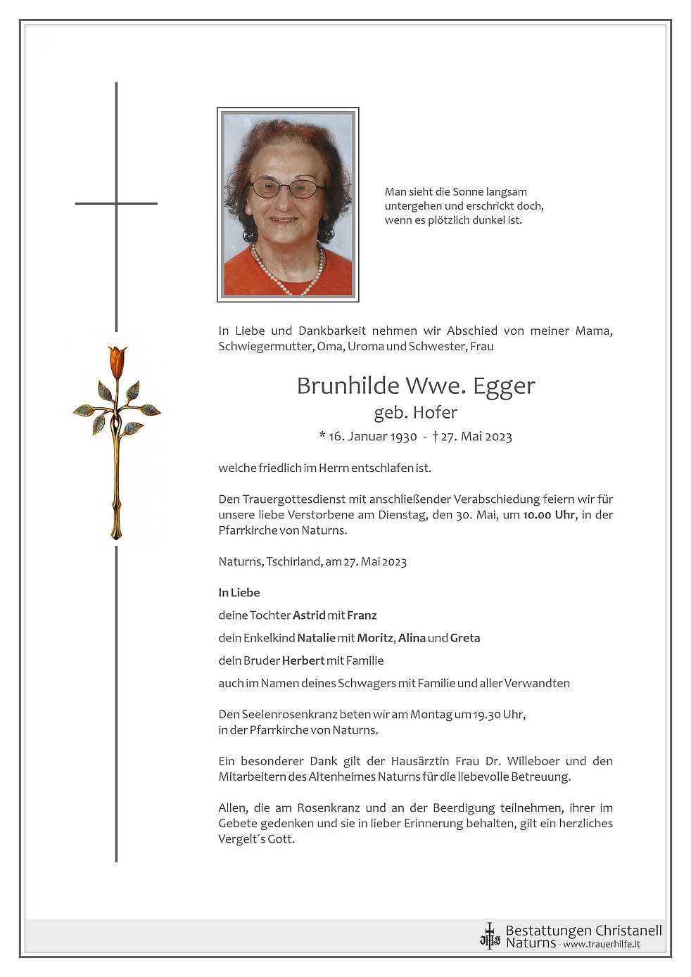 Den Trauergottesdienst mit anschließender Verabschiedung feiern wir für unsere liebe Verstorbene am Dienstag, den 30. Mai, um 10.00 Uhr, in der Pfarrkirche von Naturns.
