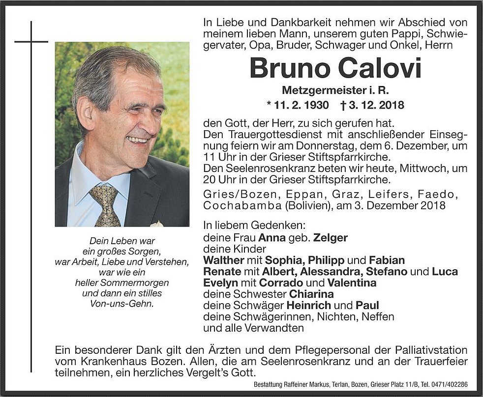 Gries/Bozen, Eppan, Graz, Leifers, Faedo, Cochabamba (Bolivien), am 3. Dezember 2018