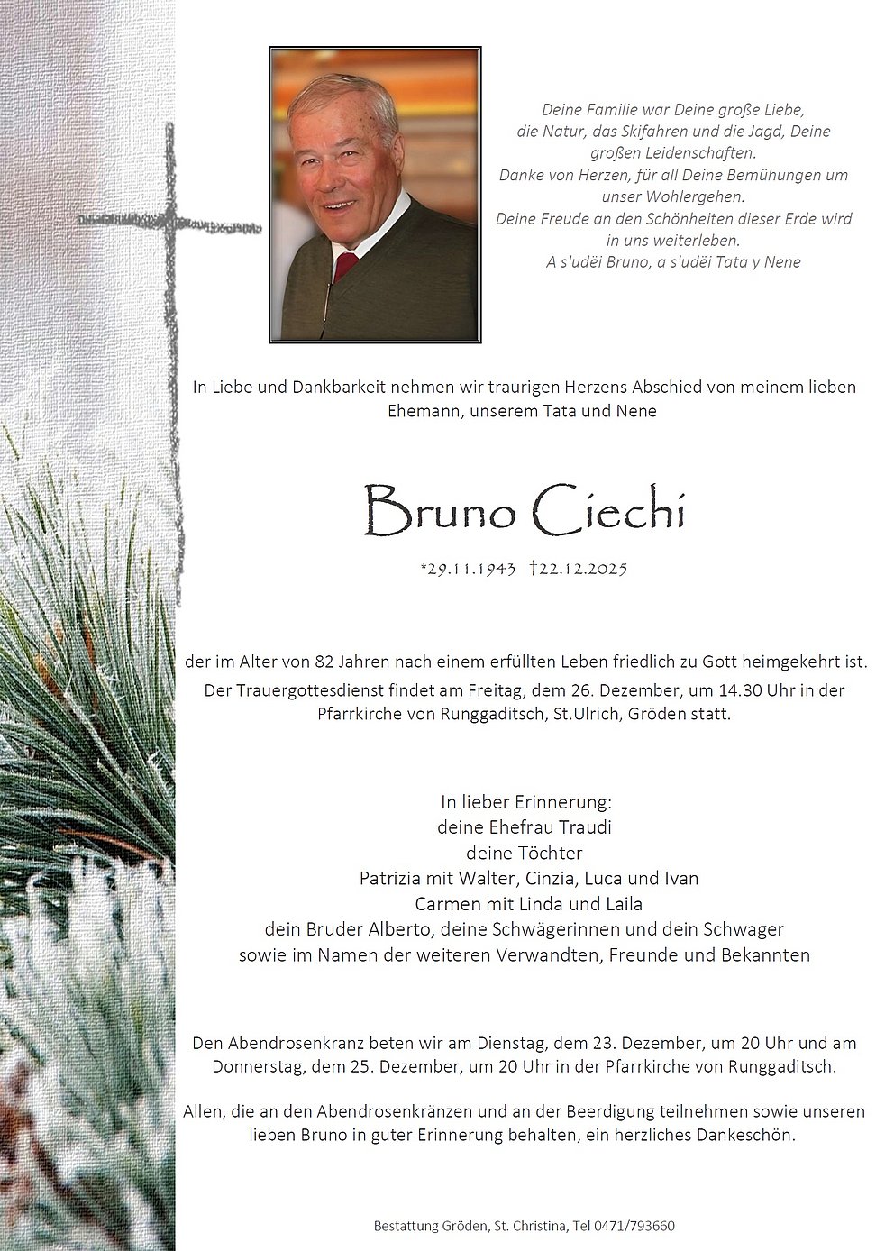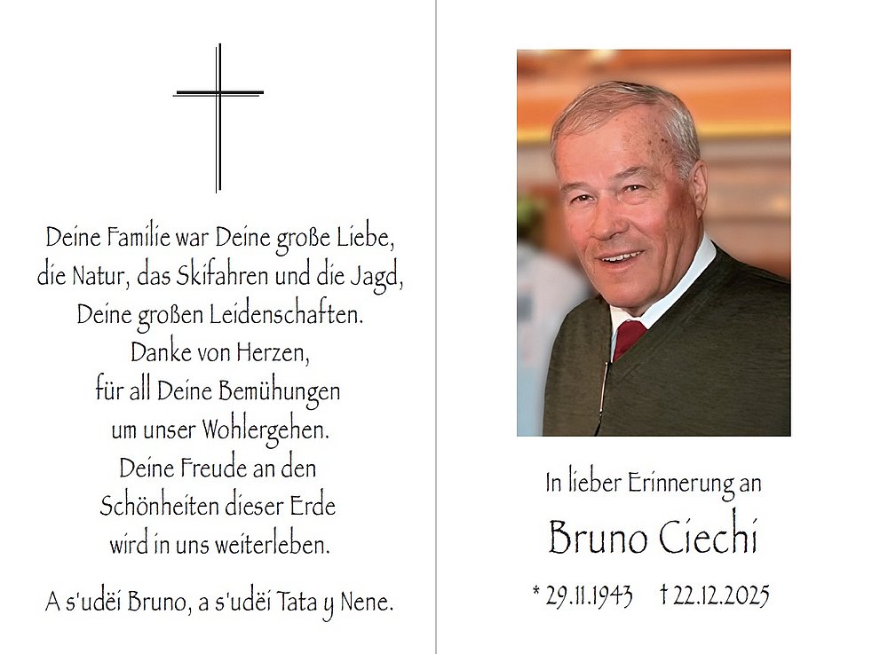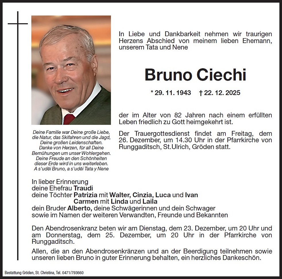 Der Trauergottesdienst findet am Freitag, dem 26. Dezember, um 14.30 Uhr in der Pfarrkirche von Runggaditsch, St.Ulrich, Gröden statt.