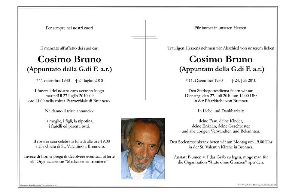 I funerali del nostro caro avranno luogo martedí il 27 luglio 2010