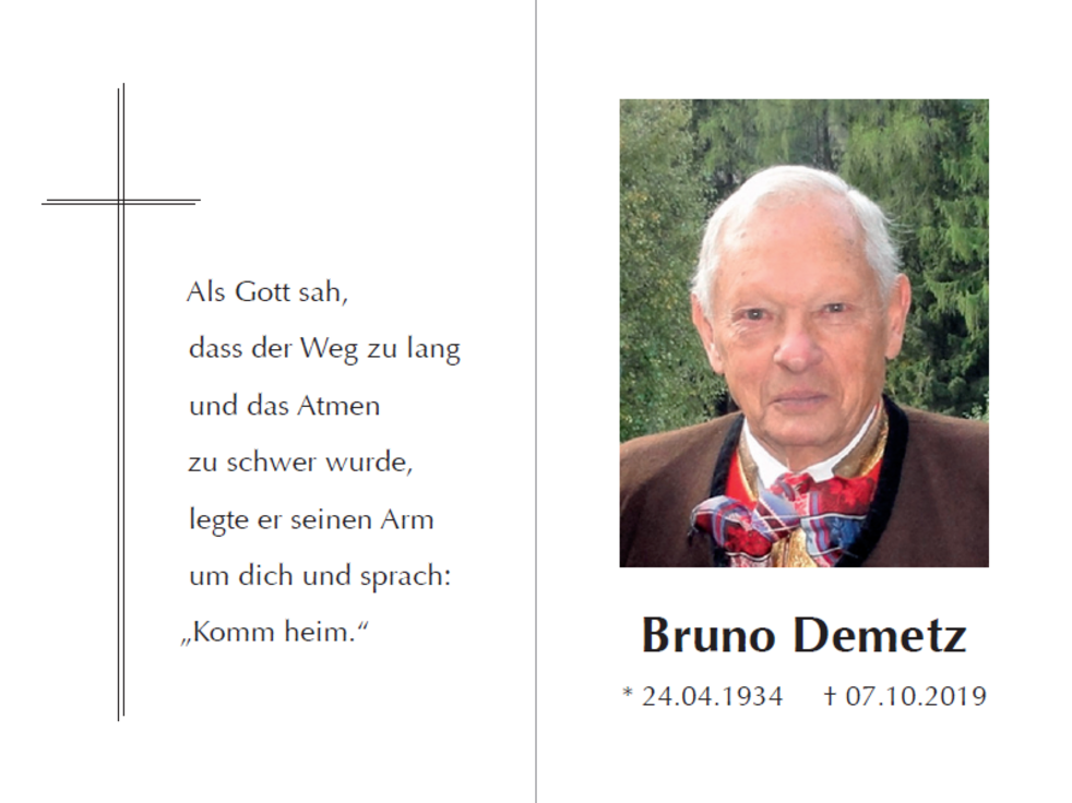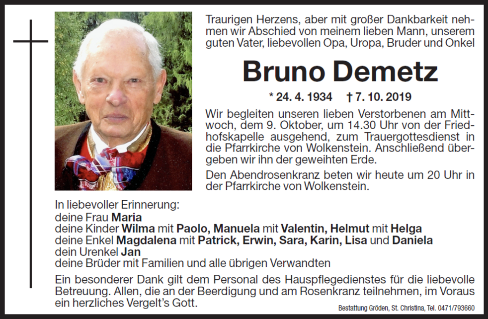 Wir begleiten unseren lieben Verstorbenen am Mittwoch, dem 09. Oktober, um 14.30 Uhr von der Friedhofskapelle ausgehend, zum Trauergottesdienst in die Pfarrkirche von Wolkenstein. Anschließend übergeben wir ihn der geweihten Erde.
