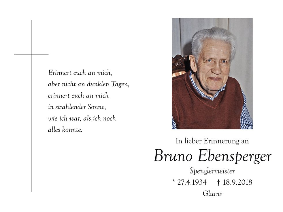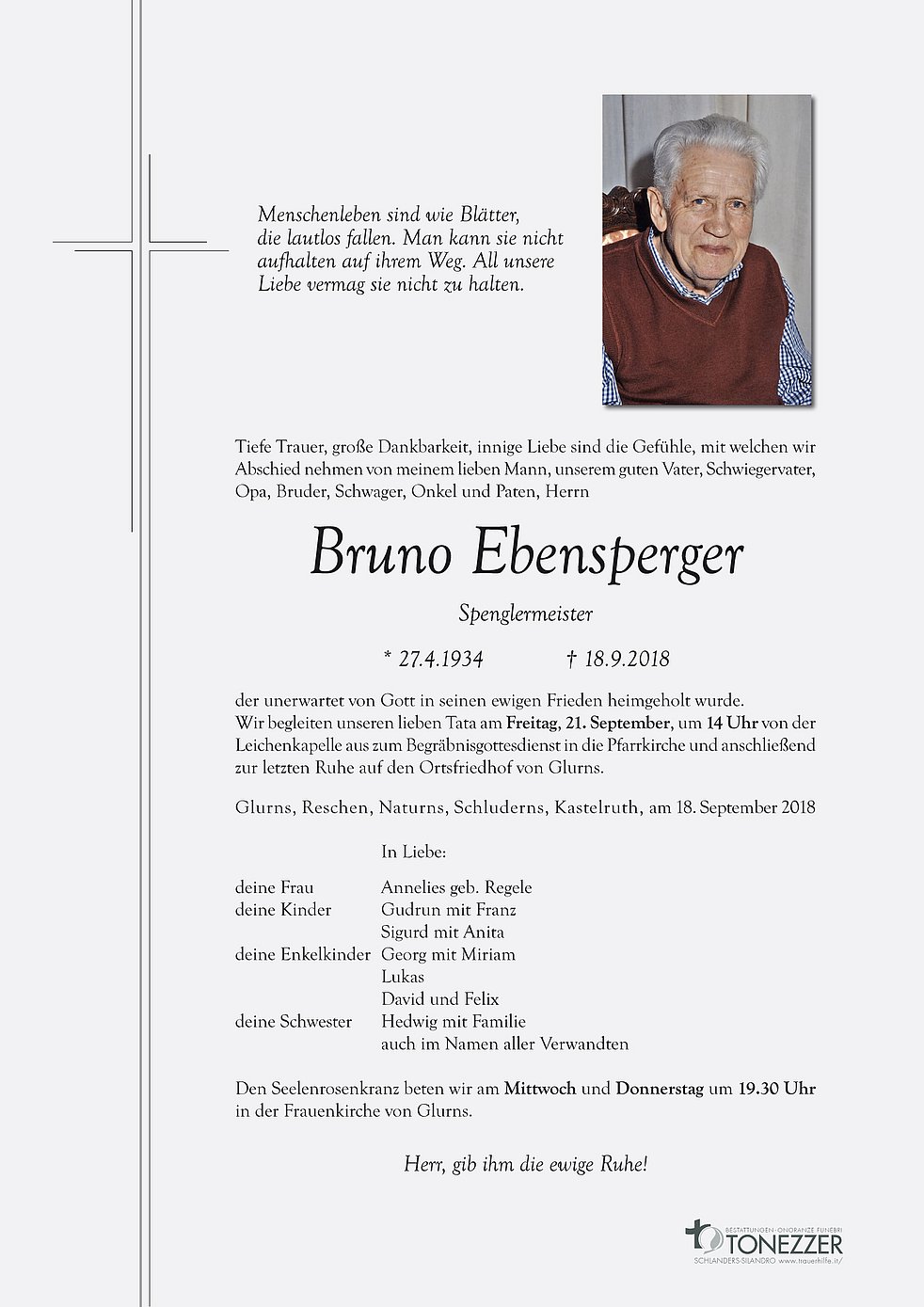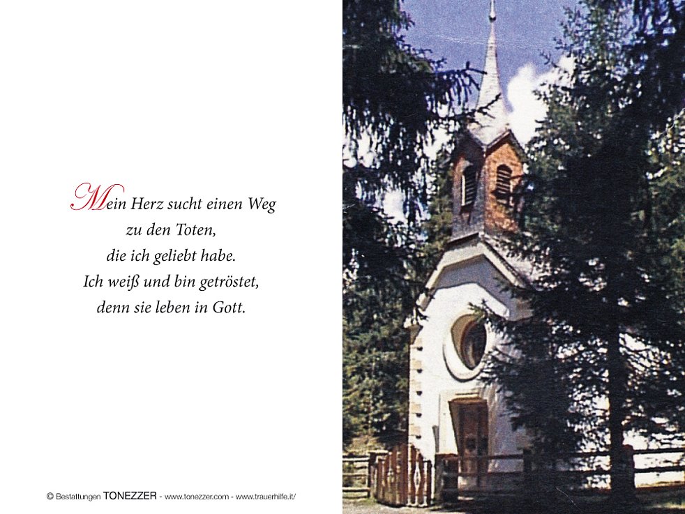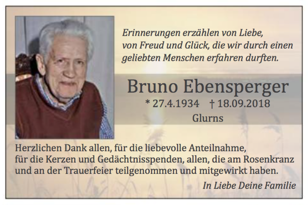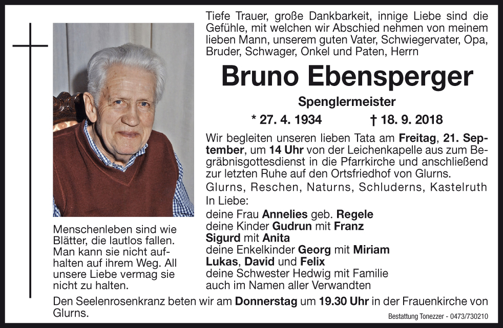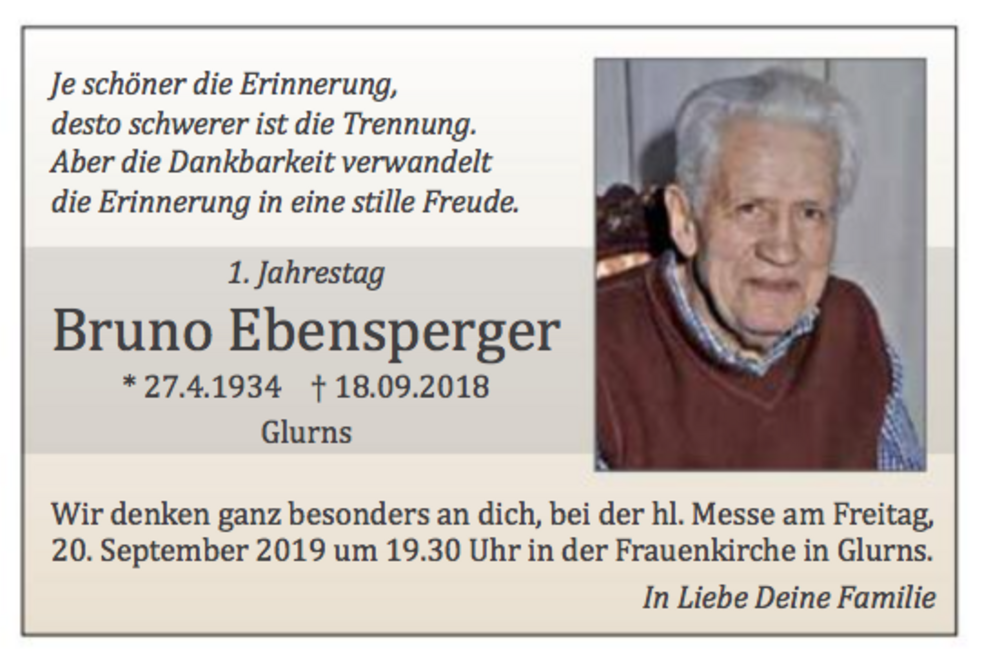 Wir begleiten unseren lieben Tata am Freitag, 21. September, um 14 Uhr von der Leichenkapelle aus zum Begräbnisgottesdienst in die Pfarrkirche und anschließend zur letzten Ruhe auf den Ortsfriedhof von Glurns.