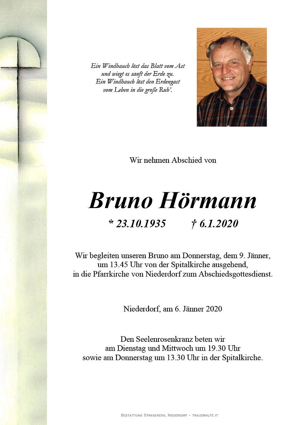 Wir begleiten unseren Bruno am Donnerstag, dem 9. Jänner, um 13.45 Uhr von der Spitalkirche ausgehend, in die Pfarrkirche von Niederdorf zum Abschiedsgottesdienst.