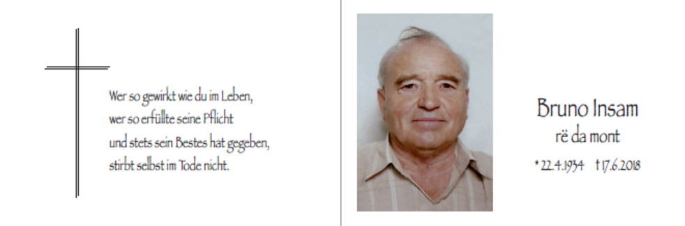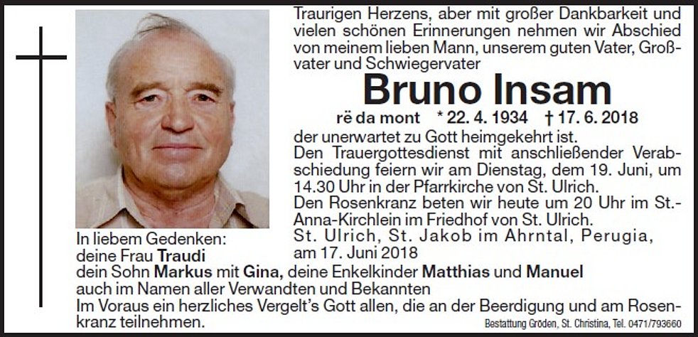 Den Trauergottesdienst mit anschließender Verabschiedung feiern wir am Dienstag, dem 19. Juni, um 14.30 Uhr in der Pfarrkirche von St. Ulrich.