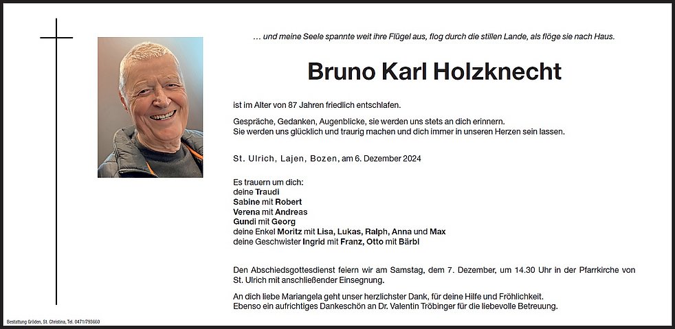 Den Abschiedsgottesdienst feiern wir am Samstag, dem 7. Dezember, um 14.30 Uhr in der Pfarrkirche von St. Ulrich mit anschließender Einsegnung.
