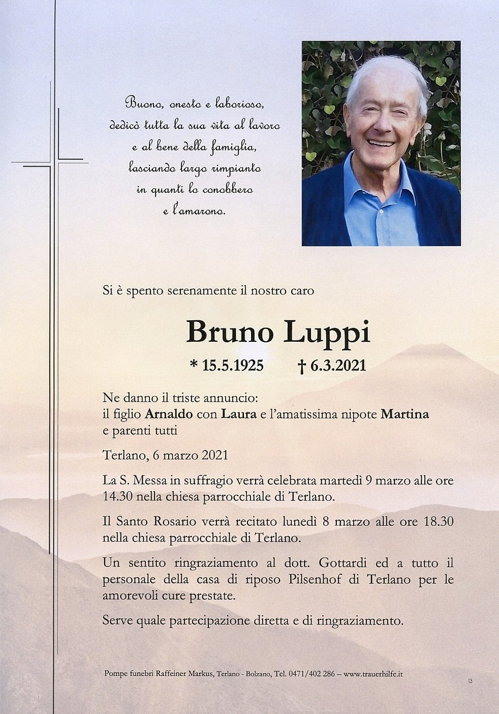La S. Messa in suffragio verrà celebrata martedì 9 marzo alle ore 14.30 nella chiesa parrocchiale di Terlano.