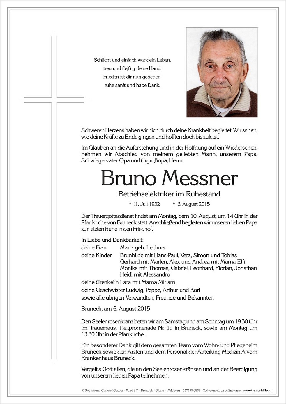 Der Trauergottesdienst findet am Montag, dem 10. August, um 14 Uhr in der Pfarrkirche von Bruneck statt. Anschließend begleiten wir unseren lieben Papa zur letzten Ruhe in den Friedhof.