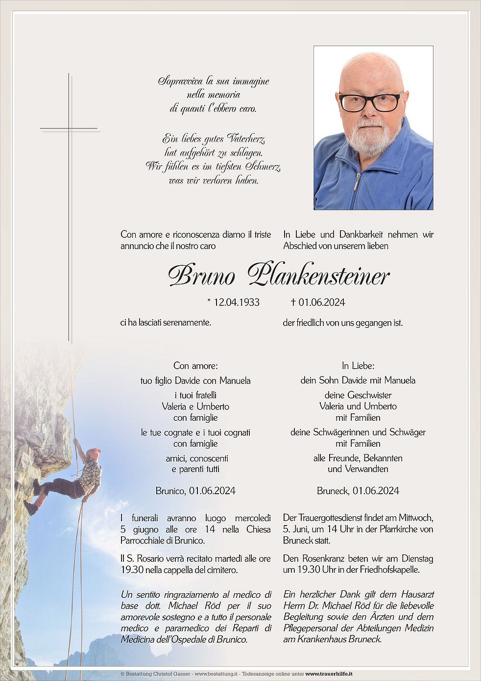 Der Trauergottesdienst findet am Mittwoch, 5. Juni, um 14 Uhr in der Pfarrkirche von Bruneck statt.