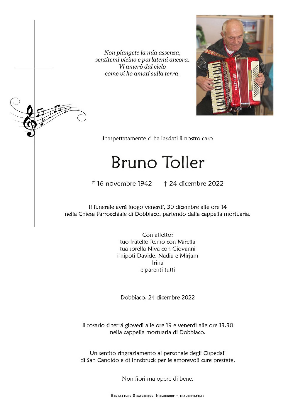 Il funerale avrà luogo venerdì, 30 dicembre alle ore 14 nella Chiesa Parrocchiale di Dobbiaco, partendo dalla cappella mortuaria.