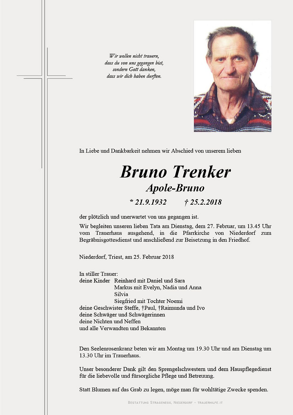 Wir begleiten unseren lieben Tata am Dienstag, dem 27. Februar, um 13.45 Uhr vom Trauerhaus ausgehend, in die Pfarrkirche von Niederdorf zum Begräbnisgottesdienst und anschließend zur Beisetzung in den Friedhof.