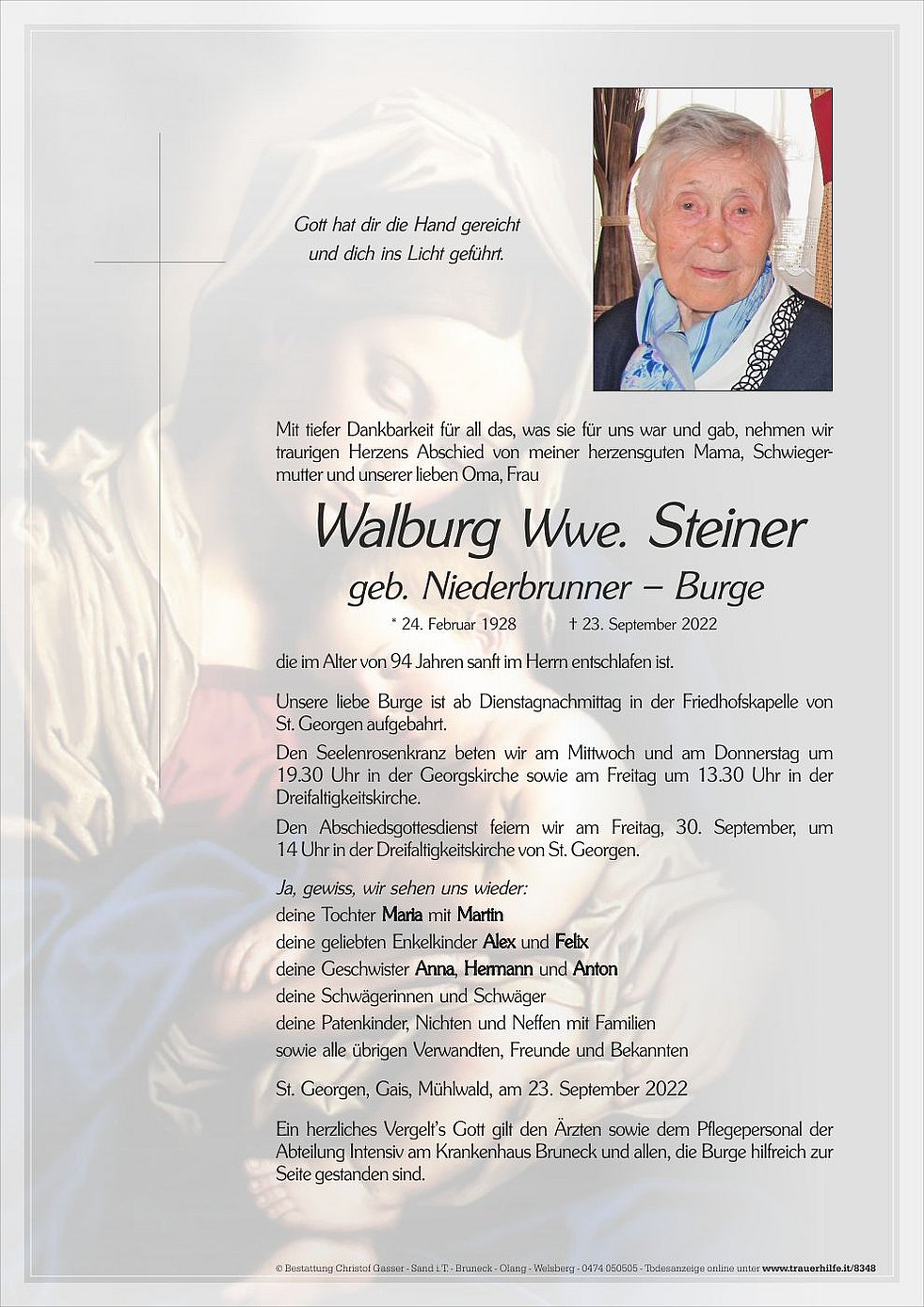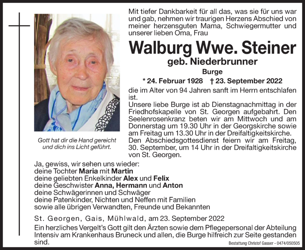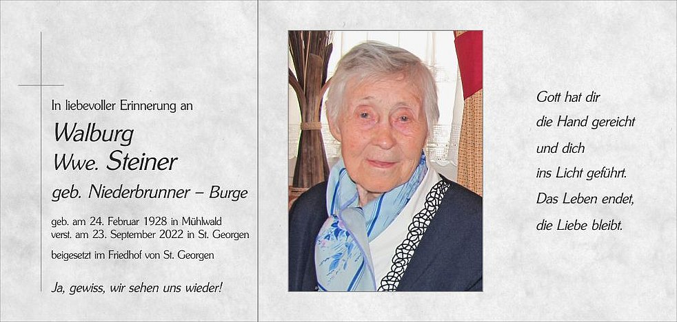 Unsere liebe Burge ist ab Dienstagnachmittag in der Friedhofskapelle von St. Georgen aufgebahrt.