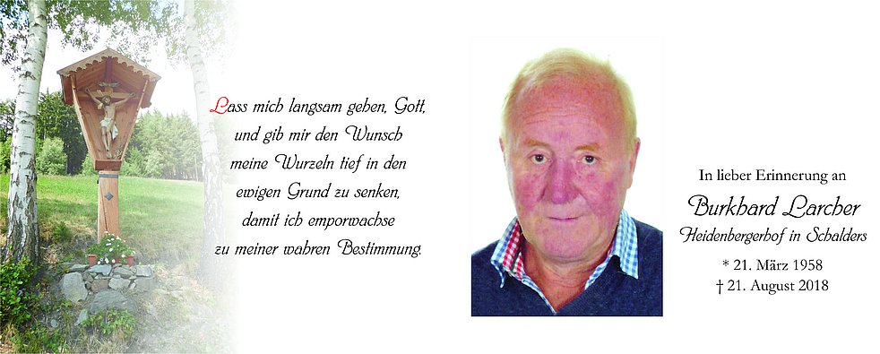 Wir begleiten unseren lieben Burkhard am Freitag, den 24. August, um 14 Uhr vom Schützenkreuz ausgehend, zum Wegscheider-Kreuz, wo um 14.30 Uhr die Einsegnung stattfindet.
