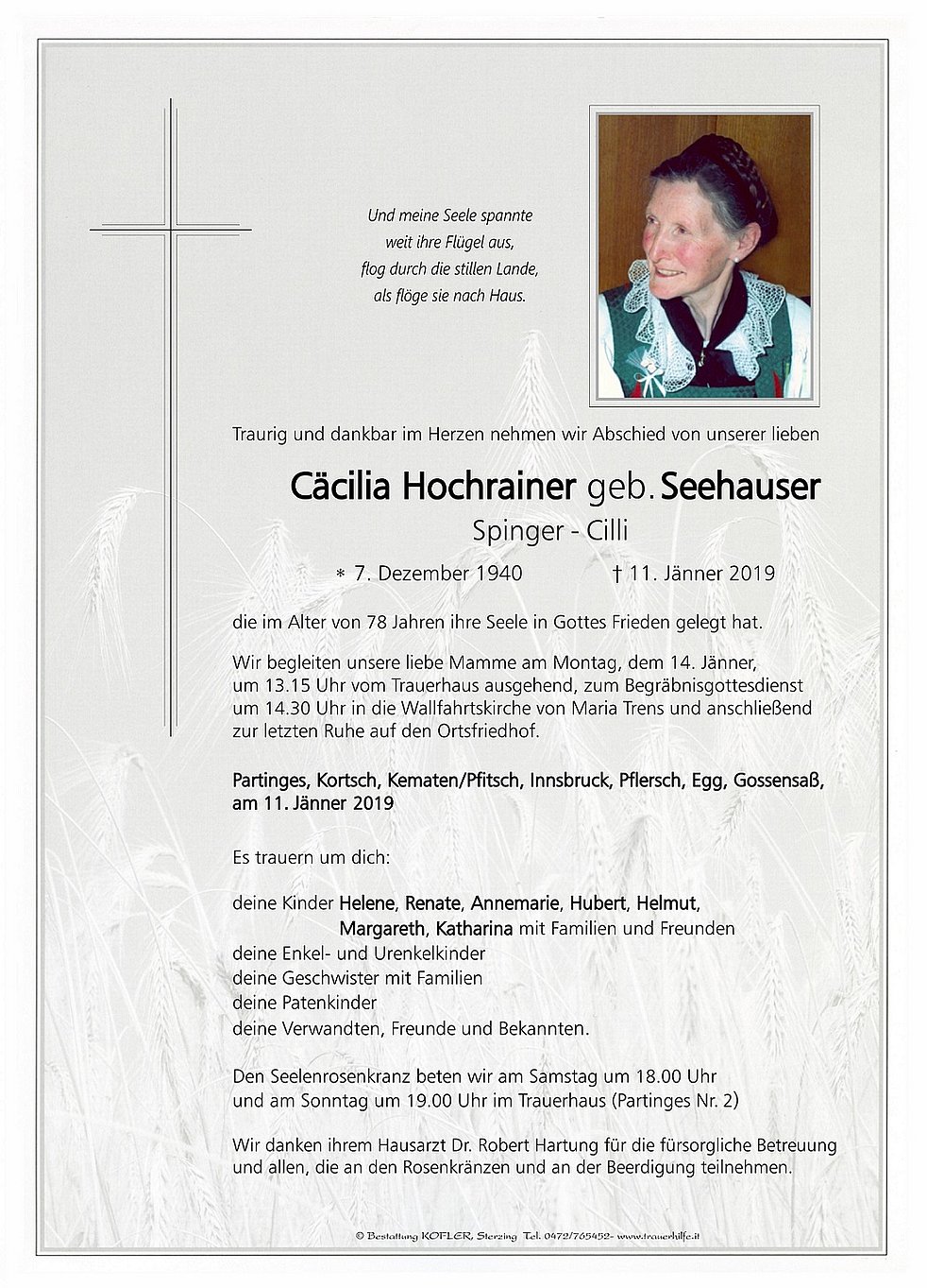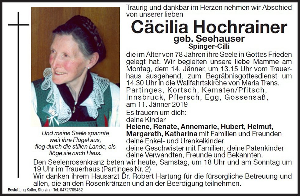 Wir begleiten unsere liebe Mamme am Montag, dem 14. Jänner, um 13.15 Uhr vom Trauerhaus ausgehend, zum Begräbnisgottesdienst um 14.30 Uhr in die Wallfahrtskirche von Maria Trens und anschließend zur letzten Ruhe auf den Ortsfriedhof.