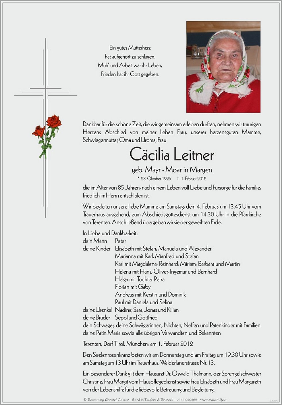 Wir begleiten unsere liebe Mamme am Samstag, dem 4. Februar, um 13.45 Uhr vom Trauerhaus ausgehend, zum Abschiedsgottesdienst um 14.30 Uhr in die Pfarrkirche von Terenten. Anschließend übergeben wir sie der geweihten Erde.