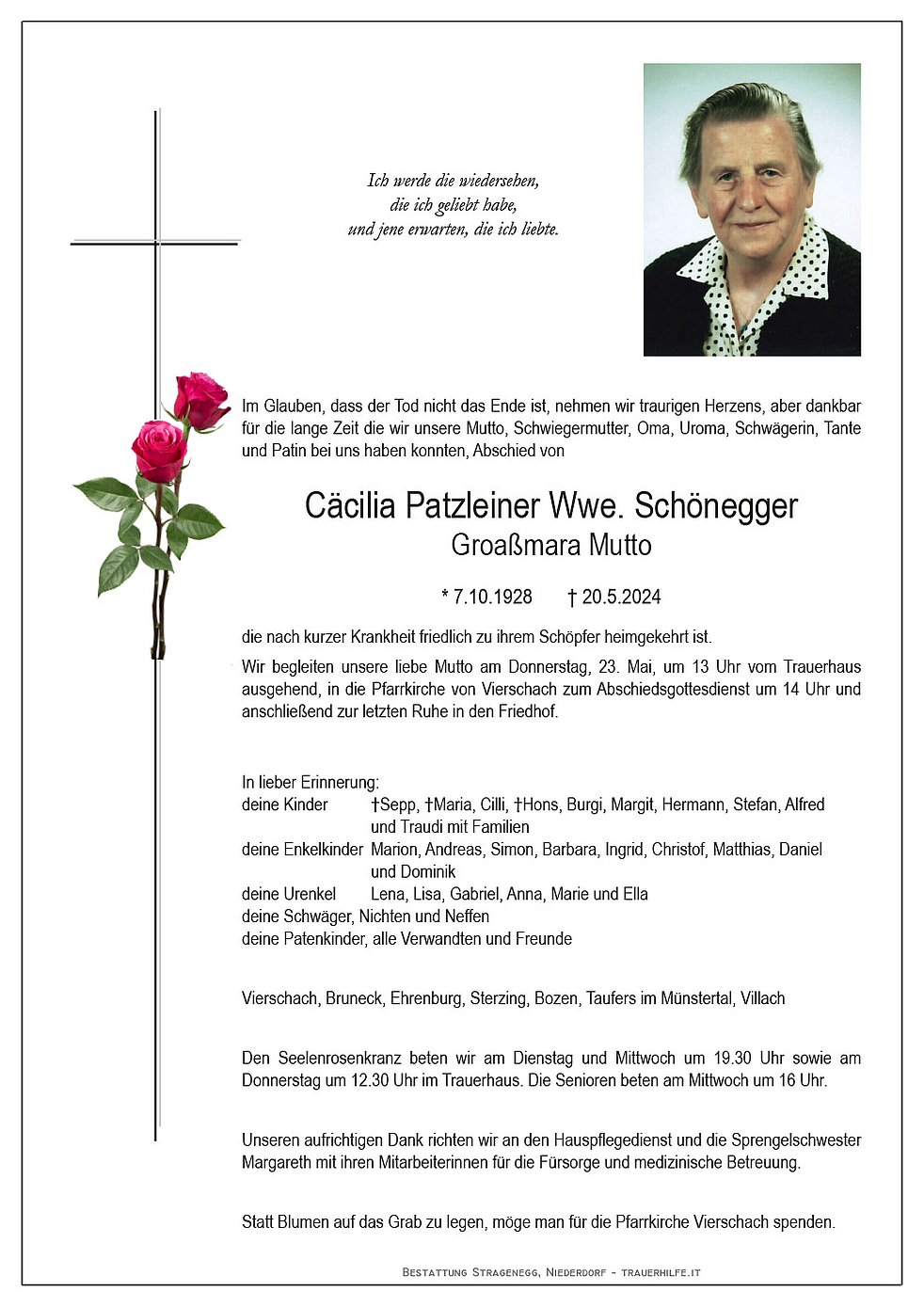 Eine Mutter zu verlieren tut immer weh , doch die schönen Erinnerungen an Früher helfen wieder die Sonne zu sehen . Das schöne ist wenn man eine Mutter viele Jahre haben kann , dann wenn ihr Körper schwächer wird , kann man auch leichter los lassen und dankend sich verabschieden. Groaßmara Mutto gute Heimreise . Cilly , Traudi , Hermann , Stefan enk wünsch i besonders mein herzliches Beileid und i druck enk fest.