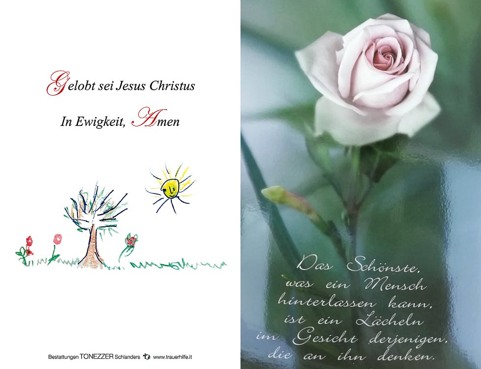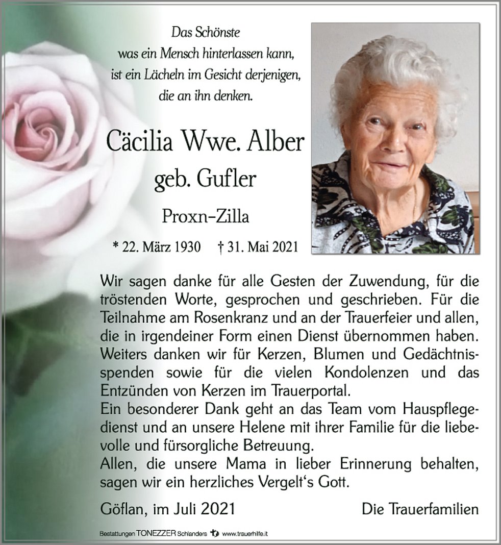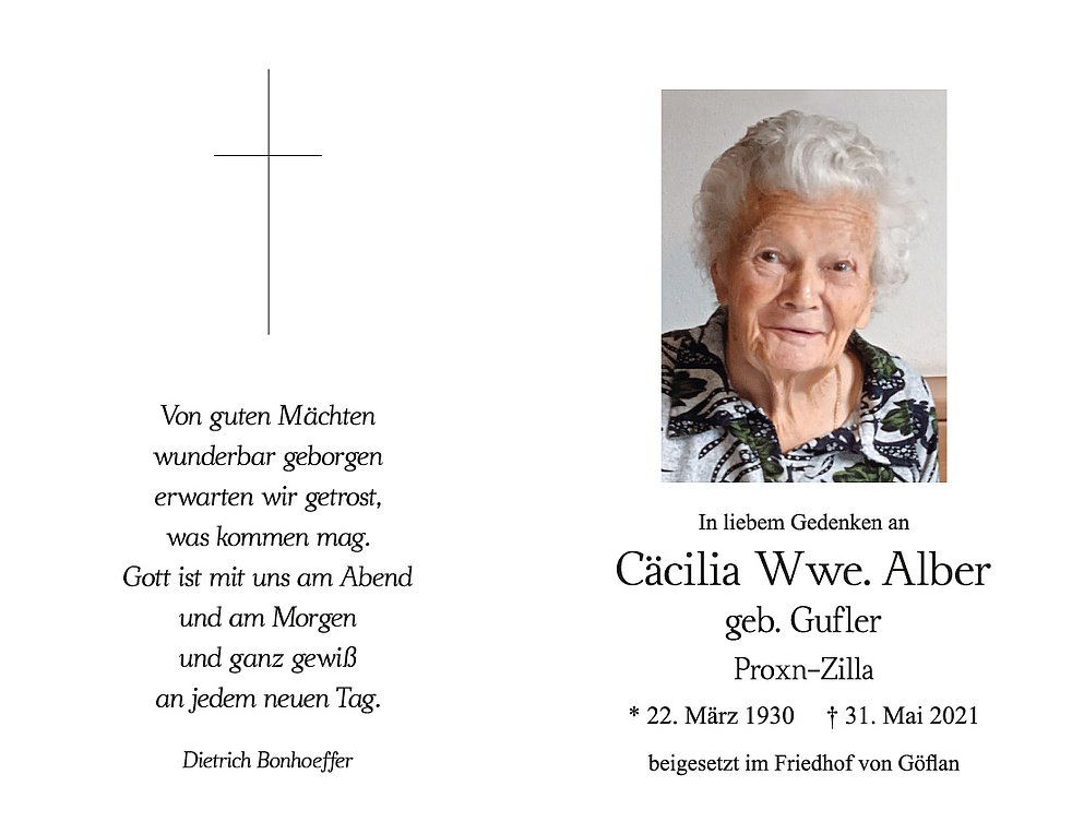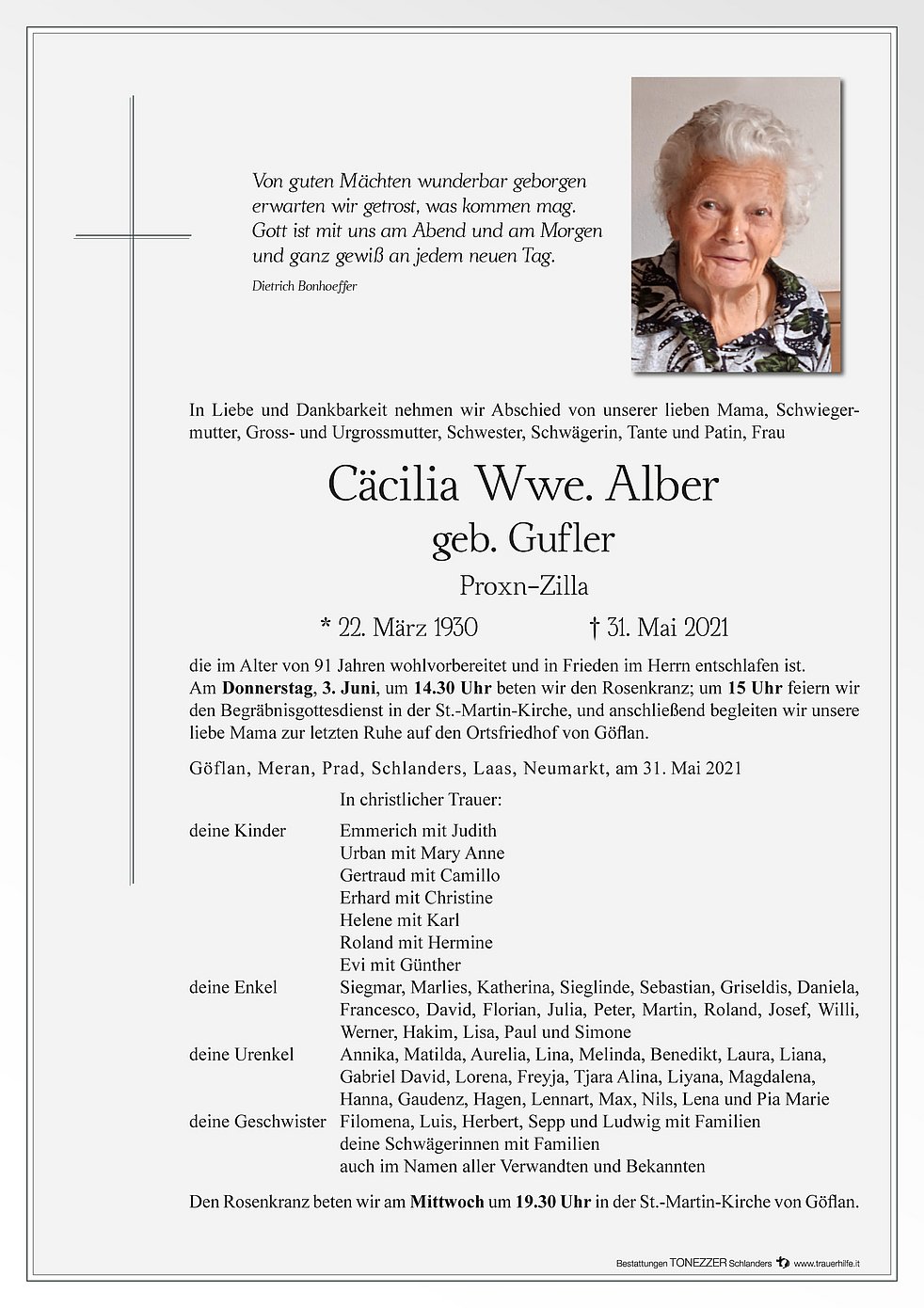 Am Donnerstag, 3. Juni, um 14.30 Uhr beten wir den Rosenkranz; um 15 Uhr feiern wir den Begräbnisgottesdienst in der St.-Martin-Kirche, und anschließend begleiten wir unsere liebe Mama zur letzten Ruhe auf den Ortsfriedhof von Göflan.